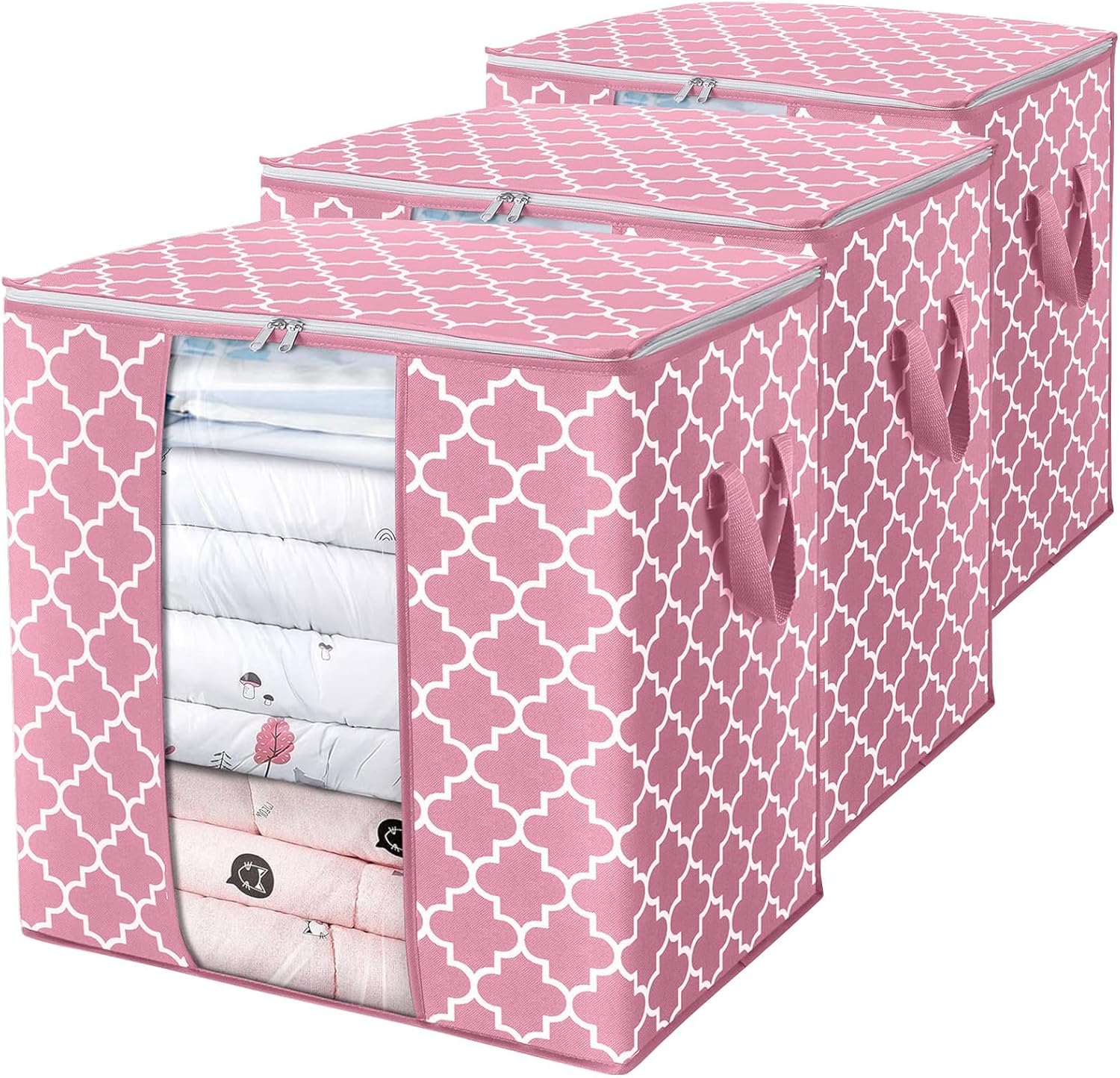 WISELIFE Storage Bags 3 Pack/100L Large Blanket Clothes Organization and Storage Containers for Comforters,Bedding, Foldable Organizer with Reinforced Handle, Clear Window, Sturdy Zippers,Pink