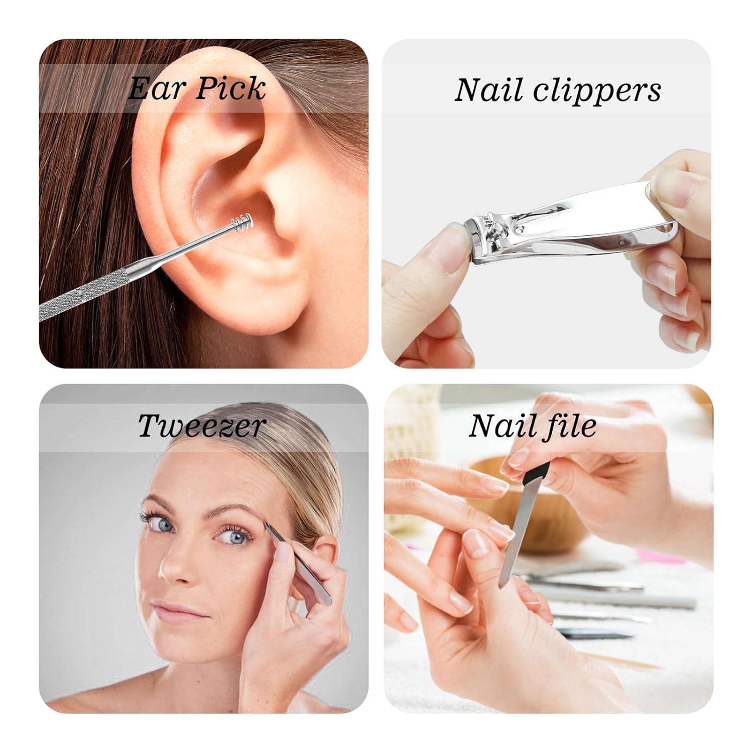 - All-In-One Manicure Solution:Complete 5-piece set includes stainless steel nail file, eyebrow tweezers, ear pick, carbon steel nail clippers, and a wine opener for versatile daily use. Versatile design caters to all your personal care needs in one compact package.