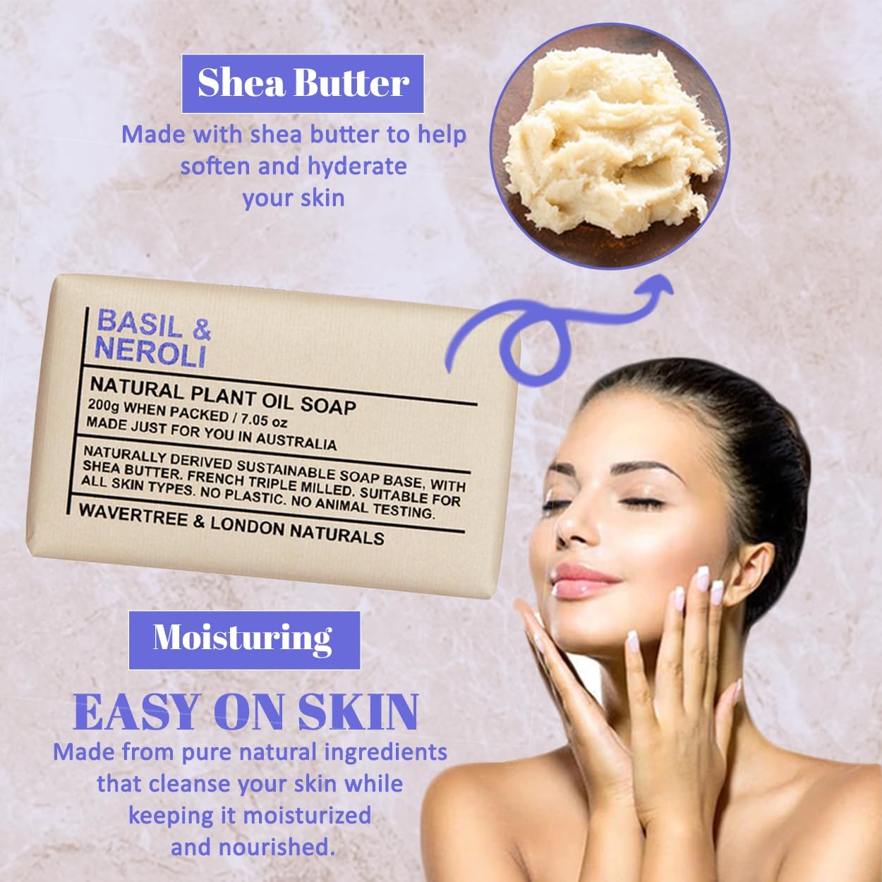 Wavertree & London Basil & Neroli Scented 100% Natural Soap Bar, 7oz Moisturizing French Triple Milled Soap Bar for Women & Men enriched with shea butter - Pure Bath & Body soap bar for All Skin Types