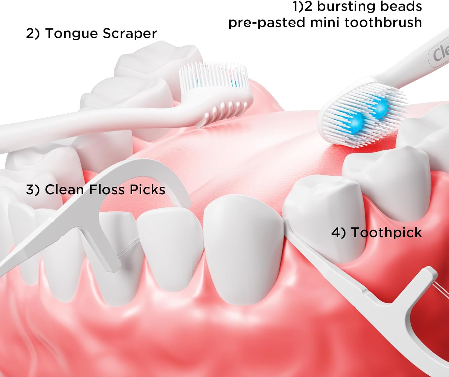 - Pre-Pasted Mini Toothbrush: Each disposable mini toothbrush comes with built-in dual burst beads—no extra tubes needed! Enjoy instant freshness with BPA-free, fluoride-free toothbrush bristles and a refreshing mint burst. Perfect for on-the-go cleanups, travel, or after meals!