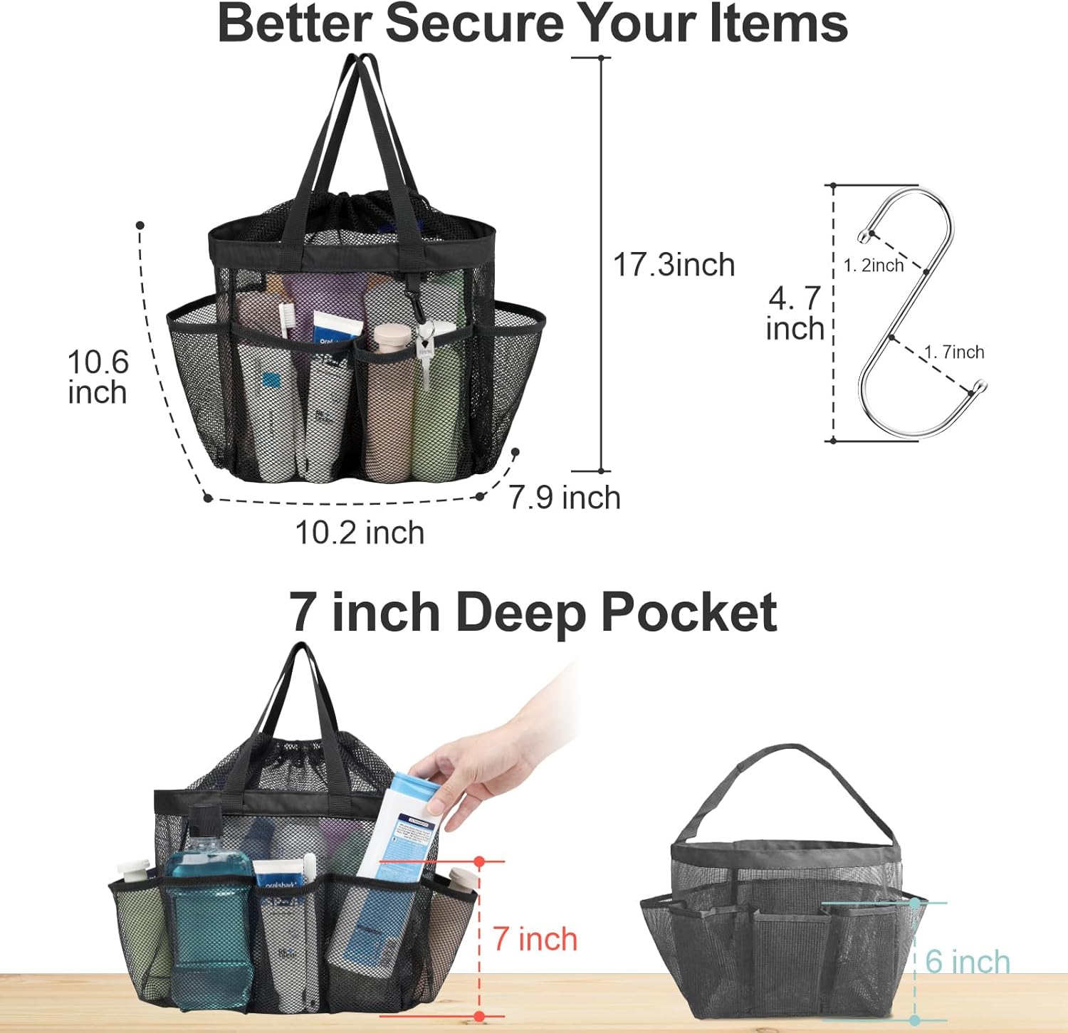 - 7 Upgraded Deep Pockets & Secure Drawstring for Peace of Mind: This shower tote bag features 7 upgraded exterior pockets with 7-inch depth, keeping tall bottles upright to prevent spills. A secure drawstring closure ensures toiletries stay safely inside—no more spills or lost items while you’re on the move
