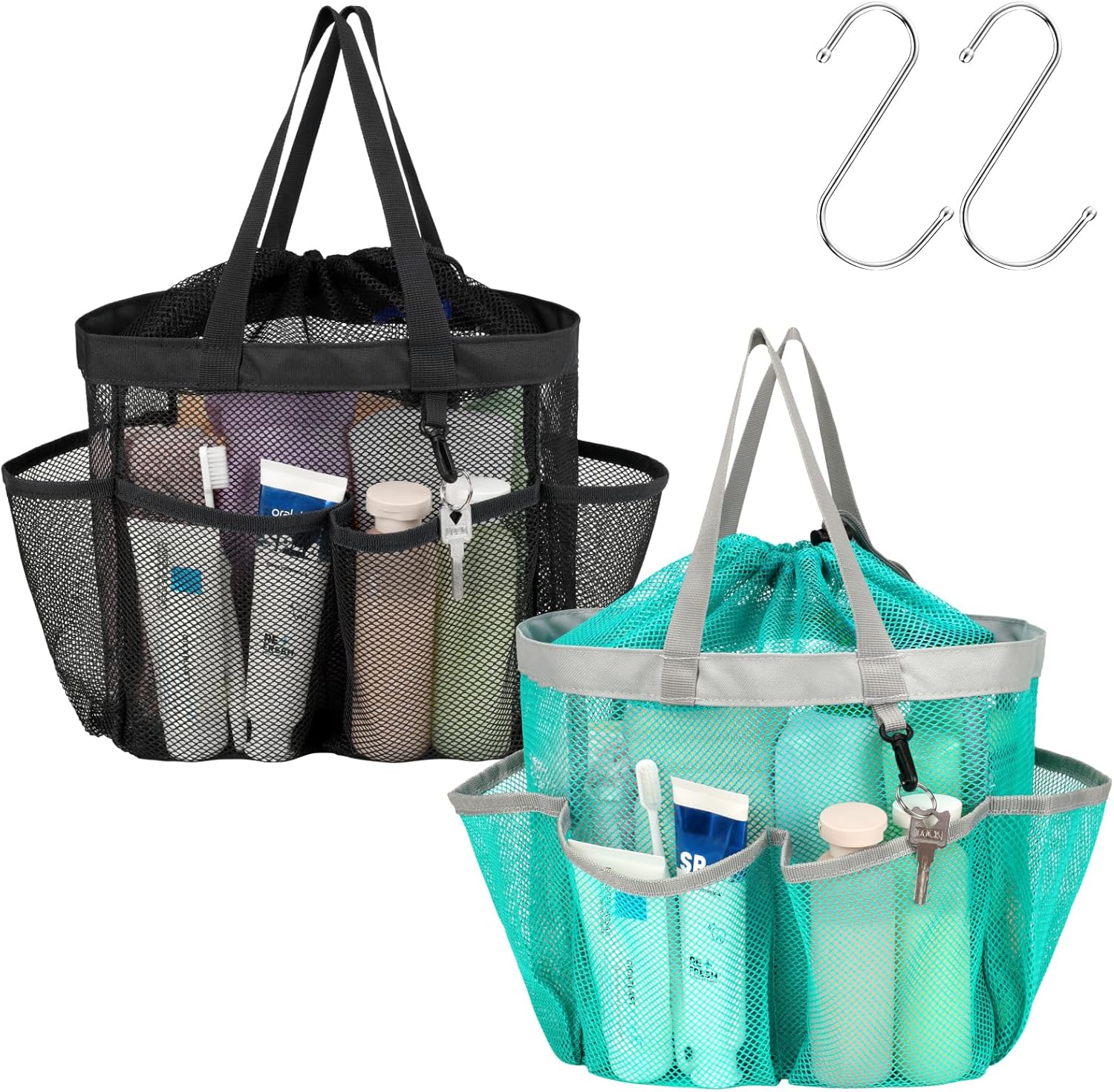 F-color Mesh Shower Caddy Portable with Drawstring - 8 Pockets Dorm Room Essentials for Guys Girls with S Hook, Shower Bag Basket Tote for College Camping Bathroom, 2 Pack Black & Mint Green