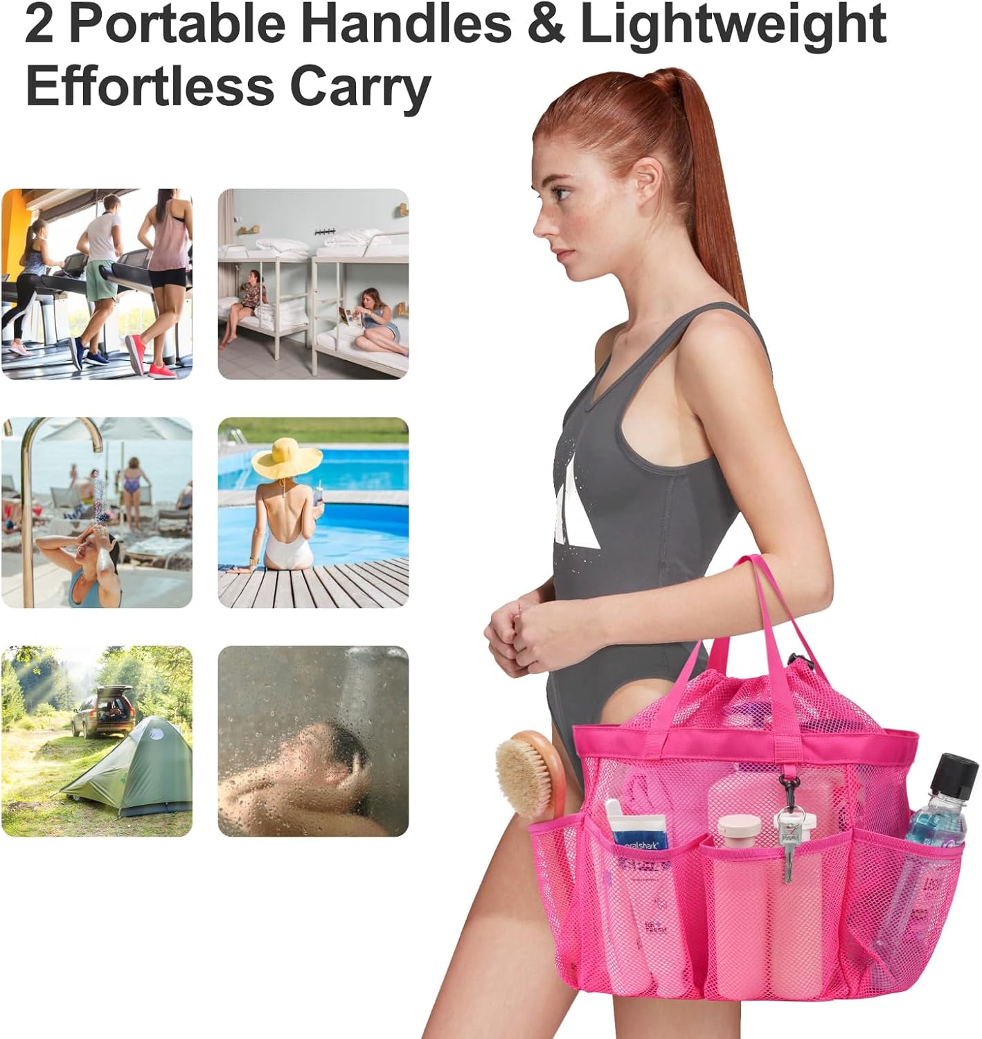 - 7 Upgraded Deep Pockets & Secure Drawstring for Peace of Mind: This shower tote bag features 7 upgraded exterior pockets with 7-inch depth, keeping tall bottles upright to prevent spills. A secure drawstring closure ensures toiletries stay safely inside—no more spills or lost items while you’re on the move