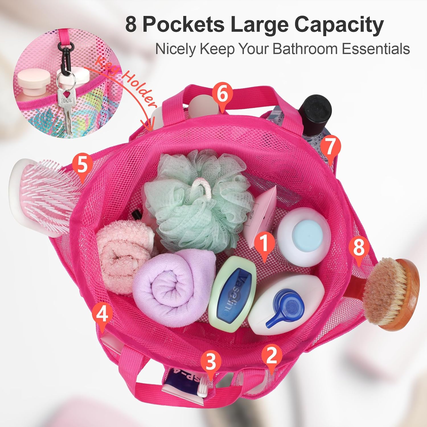 F-color Mesh Shower Caddy Portable with Drawstring - Upgrade Deeper 7 Pockets Dorm Room Essentials for Guys Girls with S Hook, Shower Bag Basket Tote for College Camping Toiletry Bathroom, Rose red