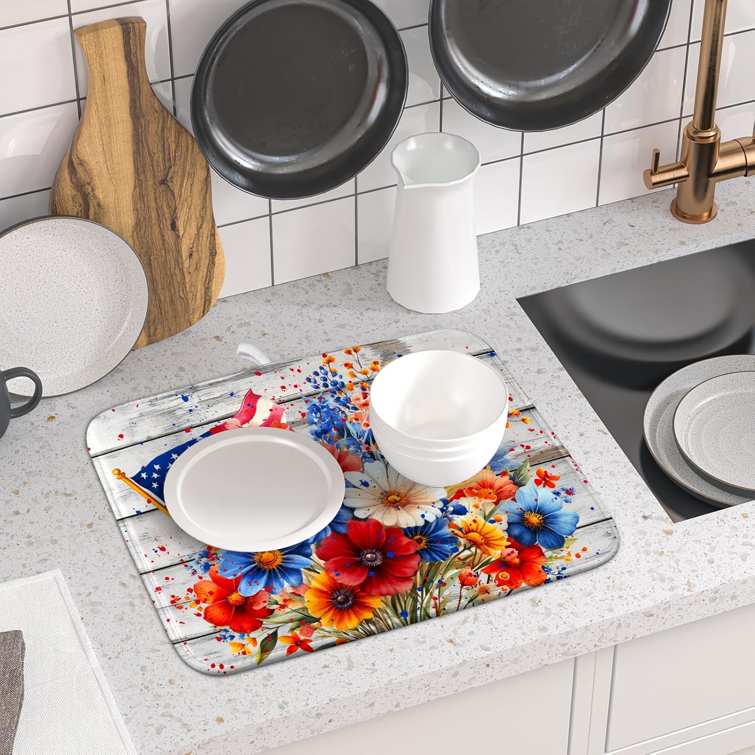4th of July Dish Drying Mat 16x18 inch Patriotic Floral Fast Dry Microfiber Reversible Dish Drainer Rack Pad Kitchen Counter Accessories