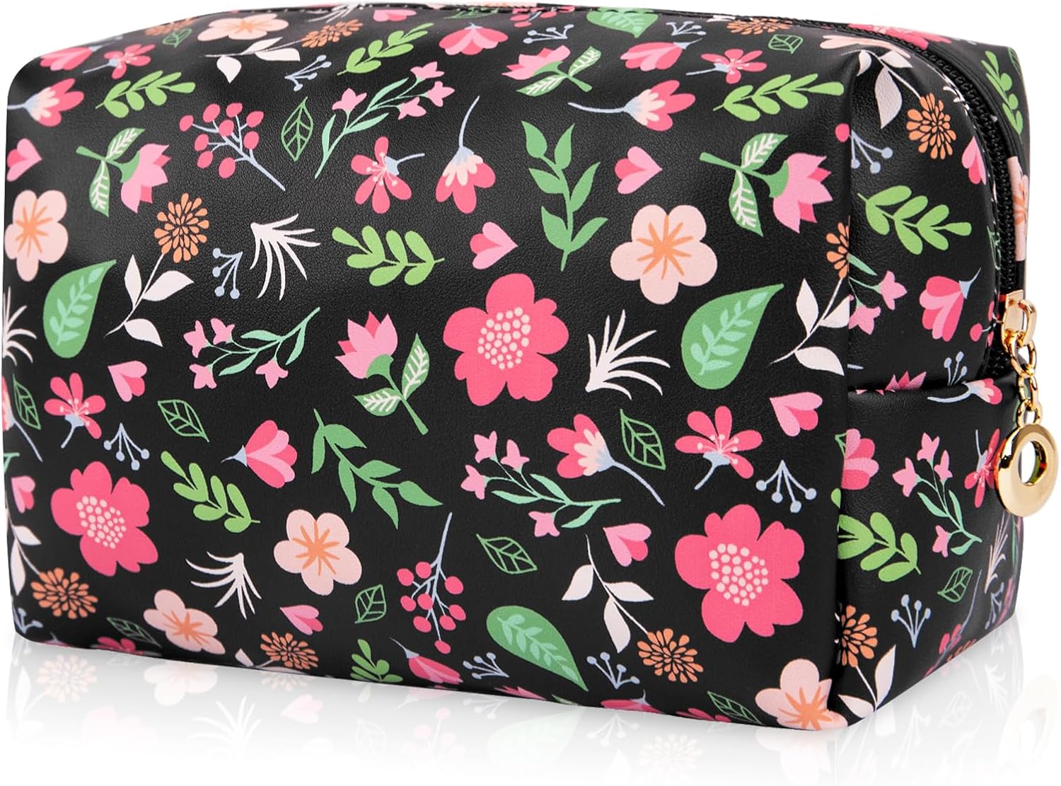 Floral Waterproof Makeup Bag, Leather Cosmetic Bag with Compartments, Zipper Make up Pouch Organizer, Portable Storage Travel Toiletry Bag Gifts for Women Girls(Black Flower)