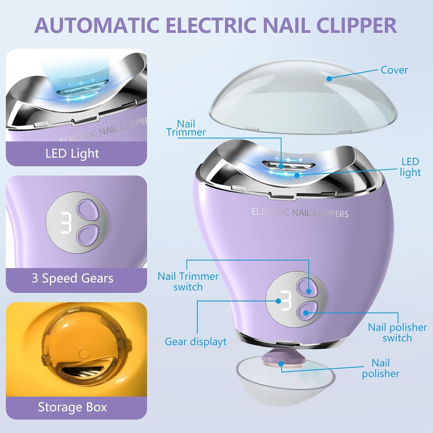 Type-C Professional Electric Nail File and Polish with LED Light & Polisher โ 3 Adjustable Speeds, Safe Nail Clippers for Seniors, Adults and Kids, Built - in Storage, Effortless Manicure - Purple