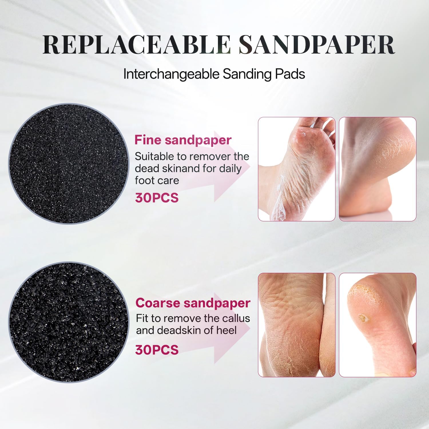 - 60 Replacement Sandpapers:Package contains 60 self-adhesive sanding discs (coarse/fine grits) for hygienic one-time use. The sanding surface efficiently removes calluses and dead skin