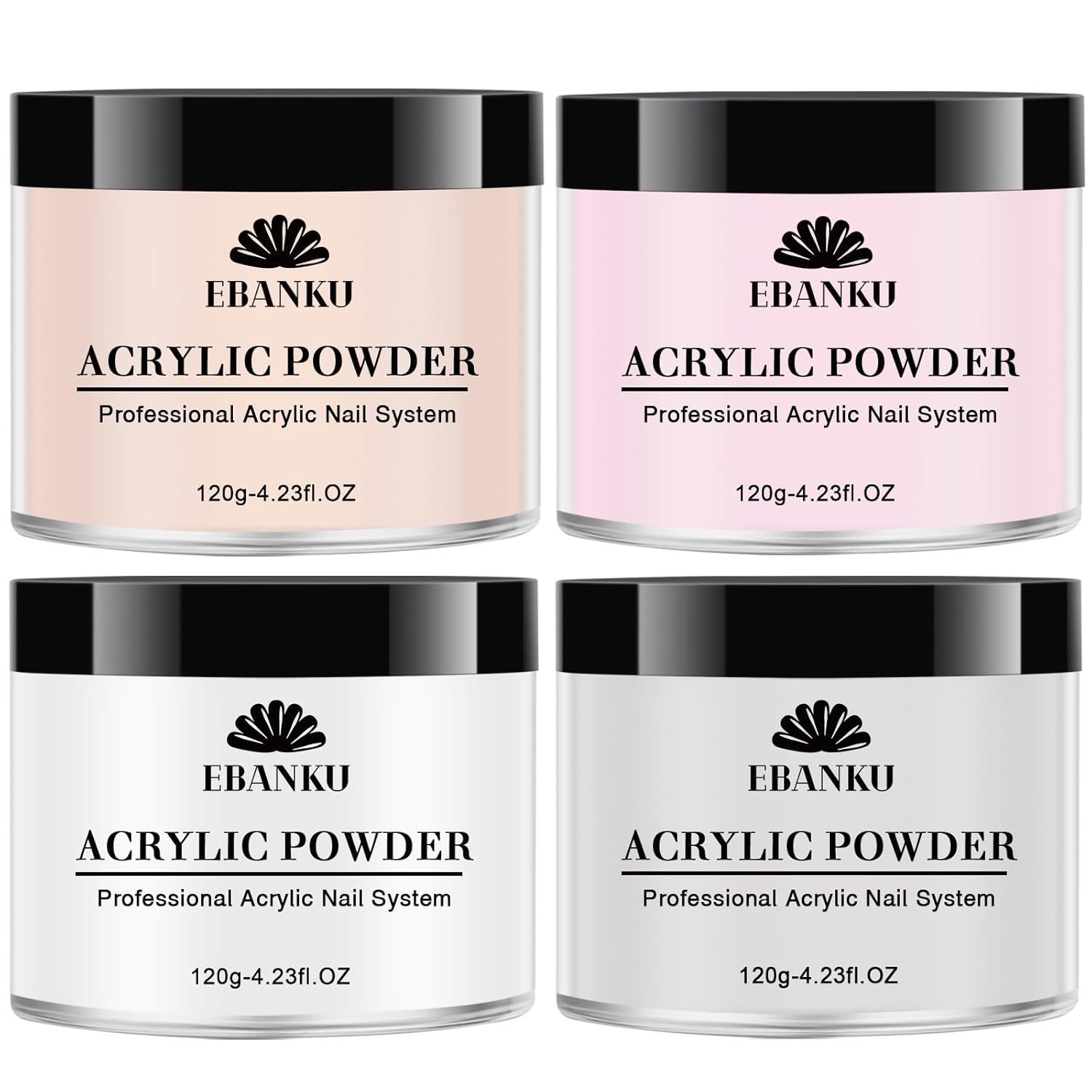 EBANKU 4 Colors Acrylic Powder Set Nude Pink White Clear Acrylic Nail Powder Acrylic Powder for Acrylic Nail Extension Nail Carving, Long-Lasting, No Nail Lamp Needed, Large Capacity 4.23oz*4