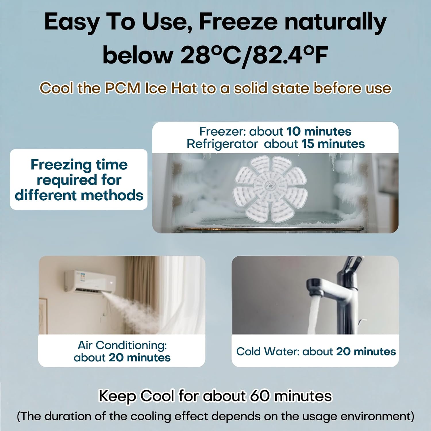 - How To Use: Ice Pack for Head, before use, you need to place the PCM Cold Pack in an environment below 28°C/82.4°F and freeze it to a solid state. you can put it in a refrigerator, air conditioner, or cold water.then put it in the hat.