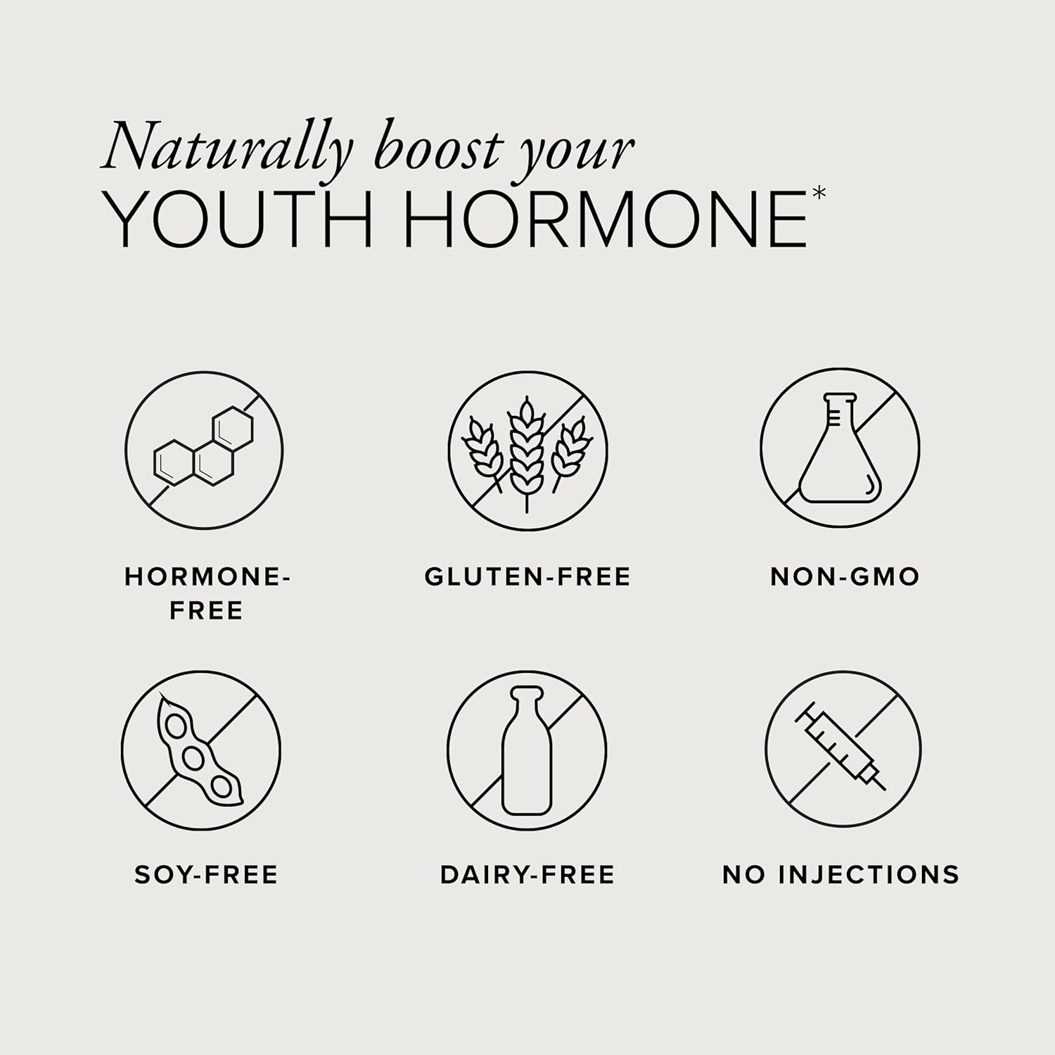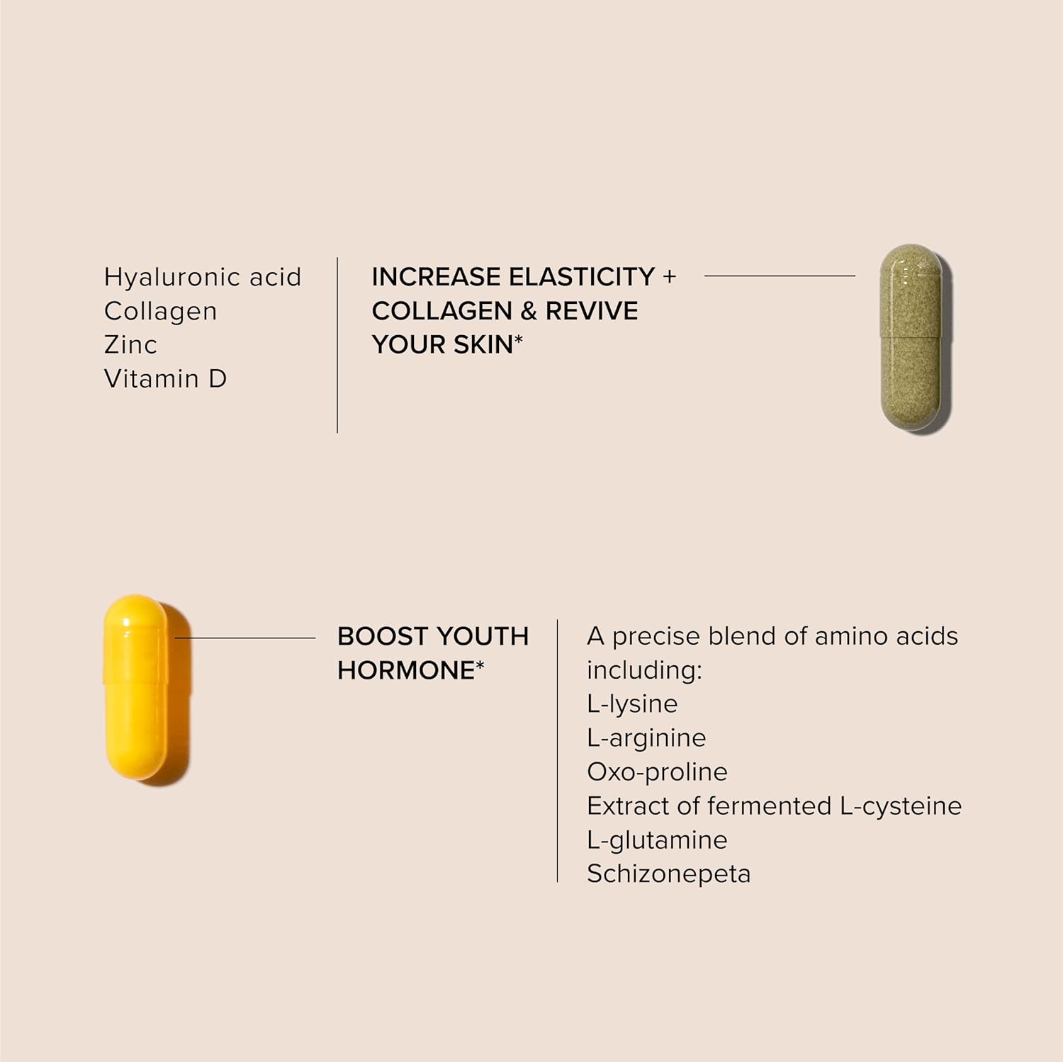 - Hyaluronic acid, zinc, collagen, and vitamin D: Targets cellular damage and helps combat the natural skin aging process, impacted by lifestyle and environment.*
