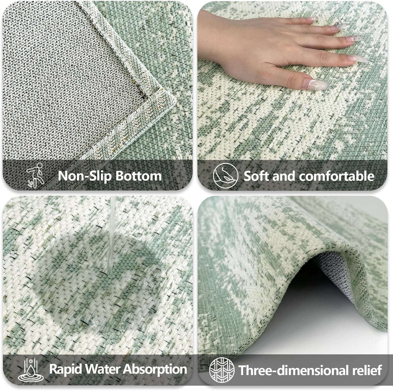 - LUSH TEXTURAL WEAVE COMFORT. Vibrant sage-green doodle patterns enhance dense polyester threading for practical underfoot support; This bath mat provides essential cushioning through compact low-pile construction ideal for sink-side step-outs