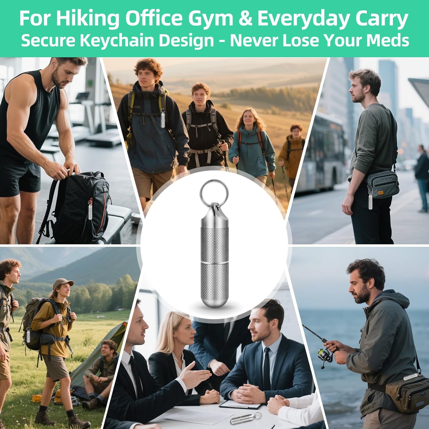 - Core Features & Benefits Crafted from 99% pure titanium—non-toxic, hypoallergenic, corrosion-resistant, and pressure-resistant. Withstands extreme temperatures. Titanium, a material used in aerospace technology, ensures pharmaceutical safety. Higher cost than plastic/metal alternatives, but unmatched safety. Screw-top lid with waterproof silicone ring—no spills from sweat, rain, or outdoor activities. Preserves medication purity and efficacy. No disruptive snapping sounds—ideal for discreet use in meetings, theaters, or public spaces. Stainless steel hook attaches to keys, backpacks, belts, etc. Versatile for commuting, hiking, cycling, and more