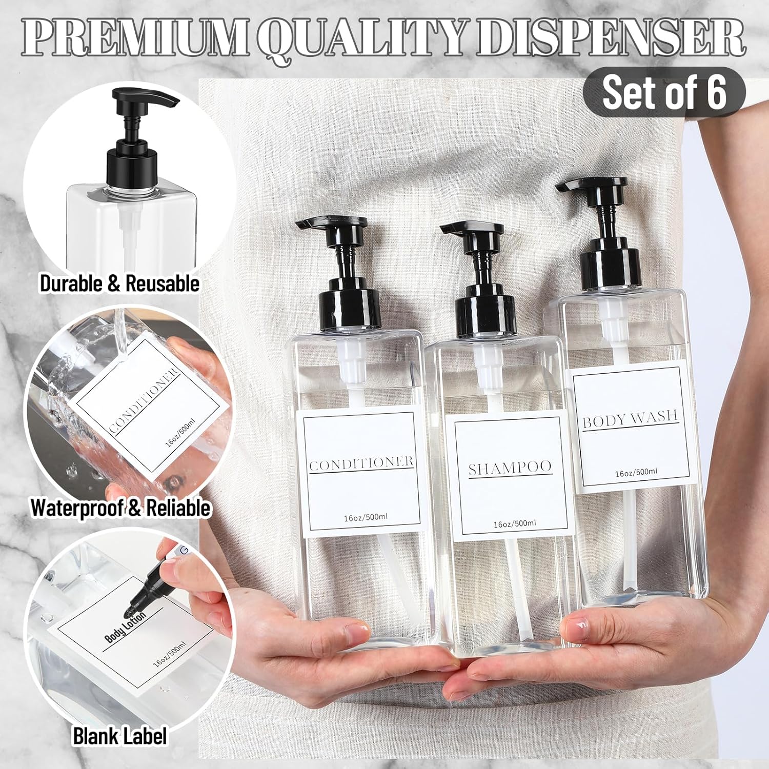 - Complete and Rich Combinations: you will get 6 pieces of refillable cosmetic pump dispensers with black pump, 2 sheets of empty labels, each sheet has 6 pieces, a total of 12 pieces of labels, and along with 1 piece of white marker pen, which can satisfy your various needs