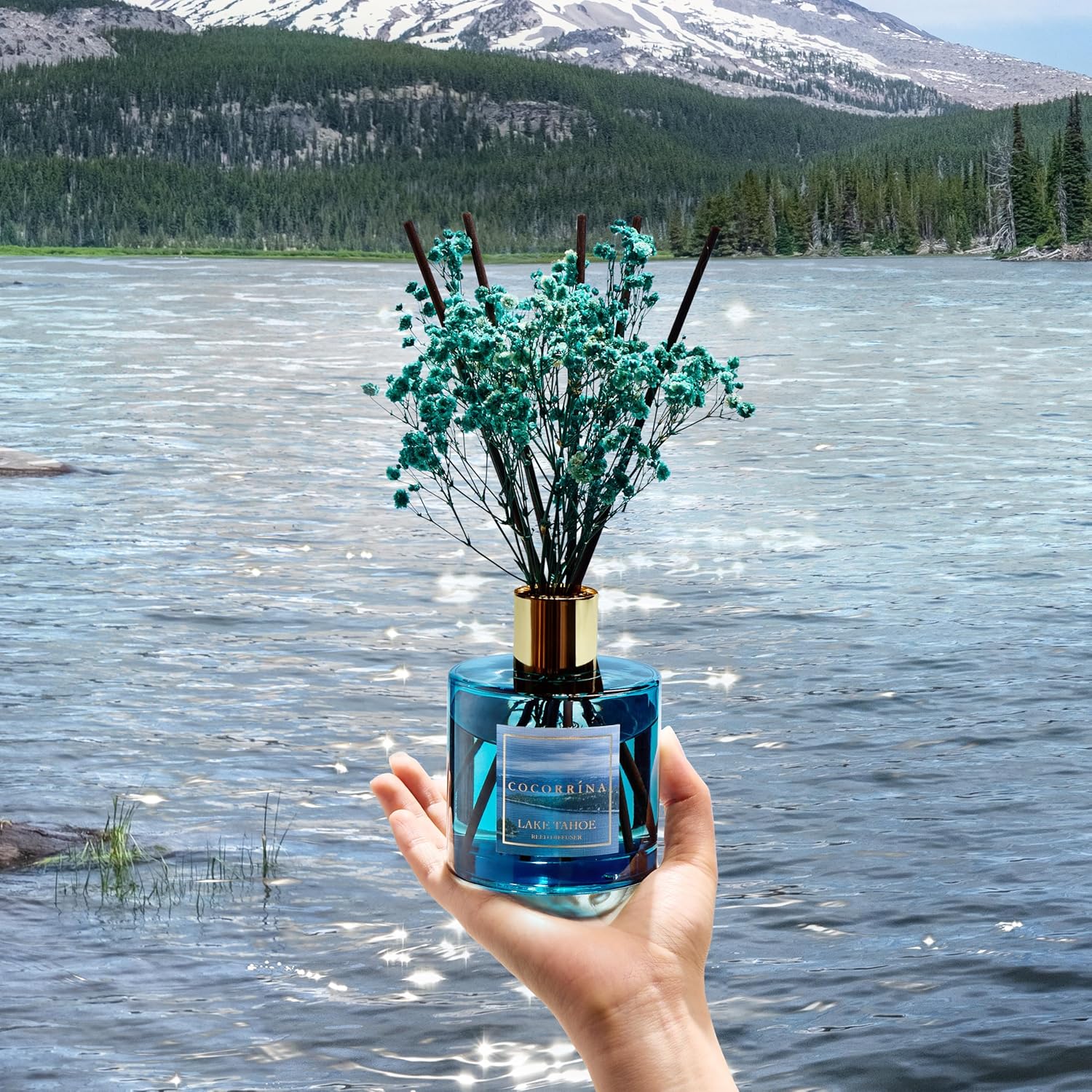 COCORRÍNA Reed Diffuser - Lake Tahoe 6.7 Fl.oz Reed Diffuser Set with 8 Sticks & Preserved Baby's Breath, Reed Diffuser for Home Bathroom Shelf Decor