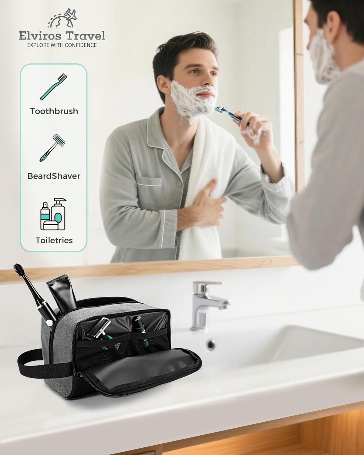 - Hanging Toiletry Bag:The Elviros travel toiletry bag for men Hanging design.Reinforced hanging loop withstand 17 lbs, enabling secure handheld transport or stable suspension even with fully loaded bags