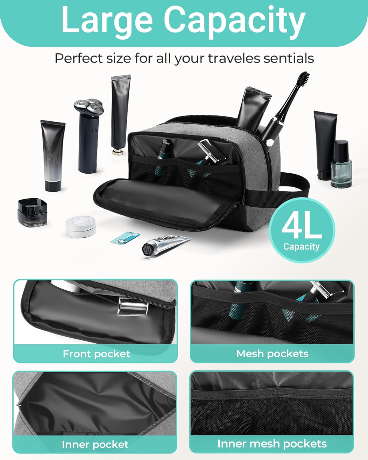- Small Toiletry Bag & Compartment Design:This shaving bag is Lightweight and compact ① Main Compartment:Fits toiletries,shampoo bottles, and shaving kits.② Front Zippered Pocket: Separates smaller items like toothbrushes or skincare products for clutter-free access.