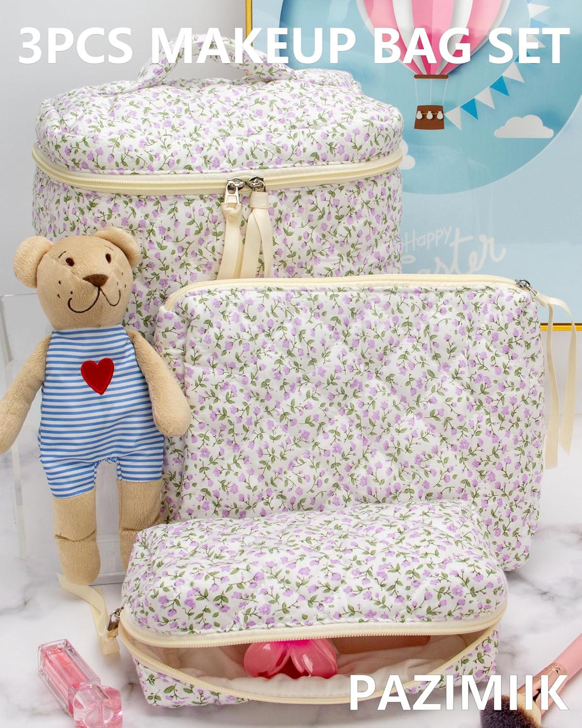PAZIMIIK 3PCS Makeup Bag SET Large Travel Quilted Zipper Soft Cosmetic Case Pouch for Women Girls Make Up,Floral Purple