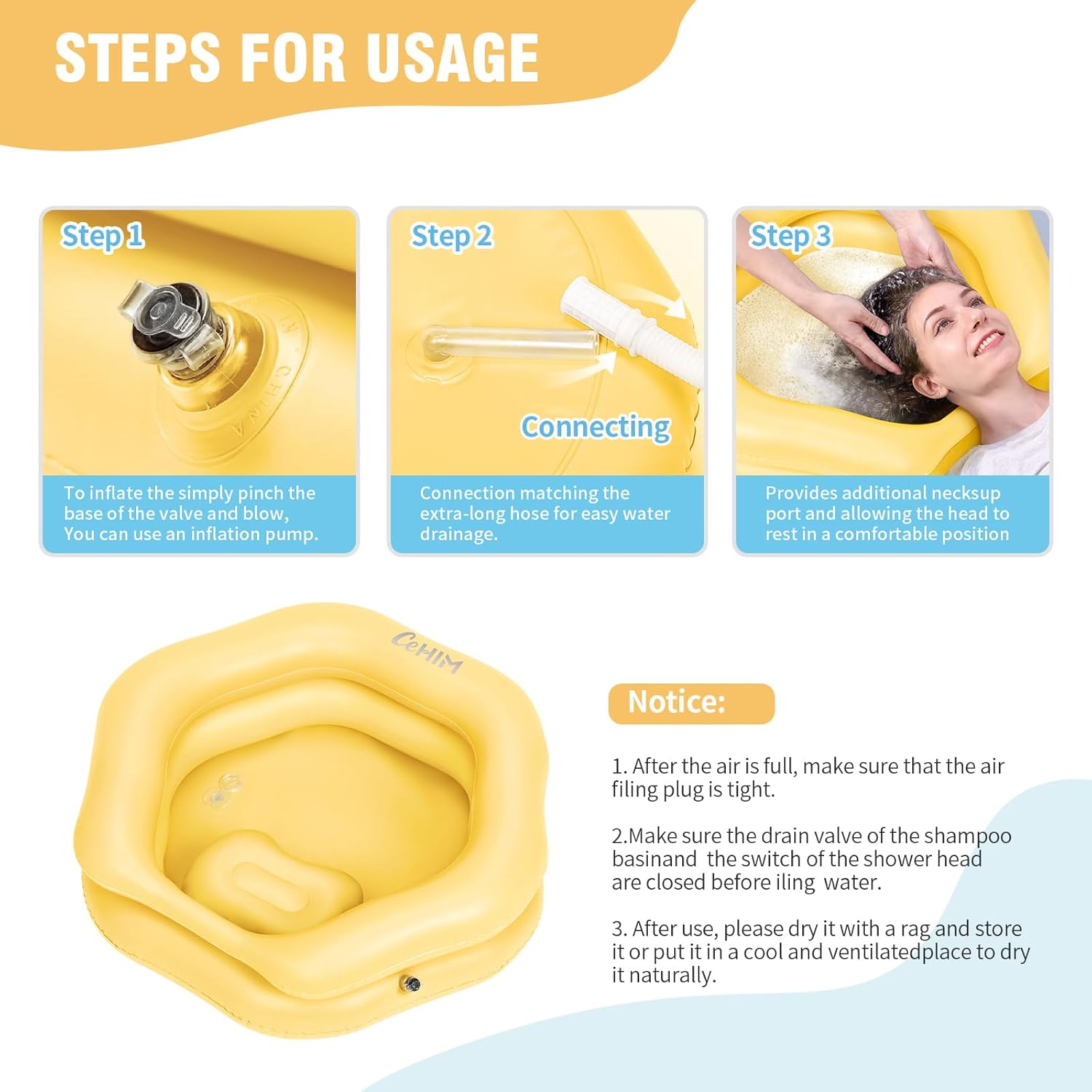 - Lightweight & Versatile Use:At just 1.1 lbs, this inflatable hair basin sets up in 3 minutes (blow up by mouth or pump). Use it on beds, couches, wheelchairs, or even camping trips—no need for a bathroom. The anti-slip base stays put, so you can focus on washing, not chasing spills.(This set does not include an inflation pump.)