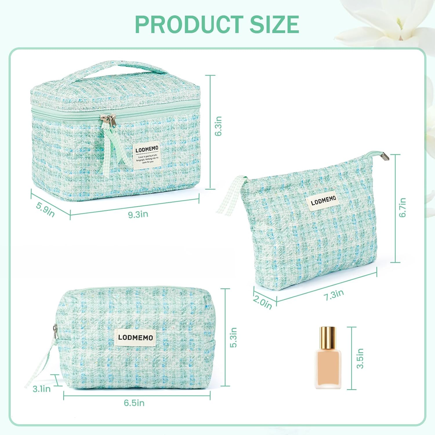 - 【3 Piece Makeup Bag Set】The cosmetic bag set includes three different sizes: large 9.3 × 6.3 × 5.9 inches, medium 7.3 × 6.7 × 2 inches, and small 6.5 × 5.3 × 3.1 inches. Whether for cosmetics, makeup brushes, toiletries, skincare products, electronics or office, these make up bag help you stay organized and meet all your storage needs