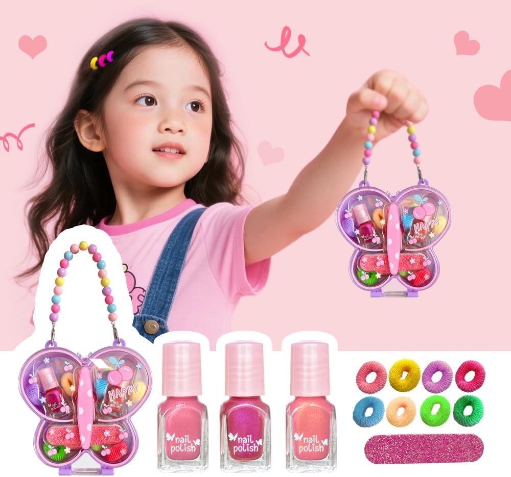 M&U MAKE YOU UP Butterfly Jewelry Case Nail & Hair Set - 3 Quick-Dry Polishes + 5 Fuzzy Elastics | Portable Beaded Clutch for Teens, FashionGift with Floral Charm Party Favors