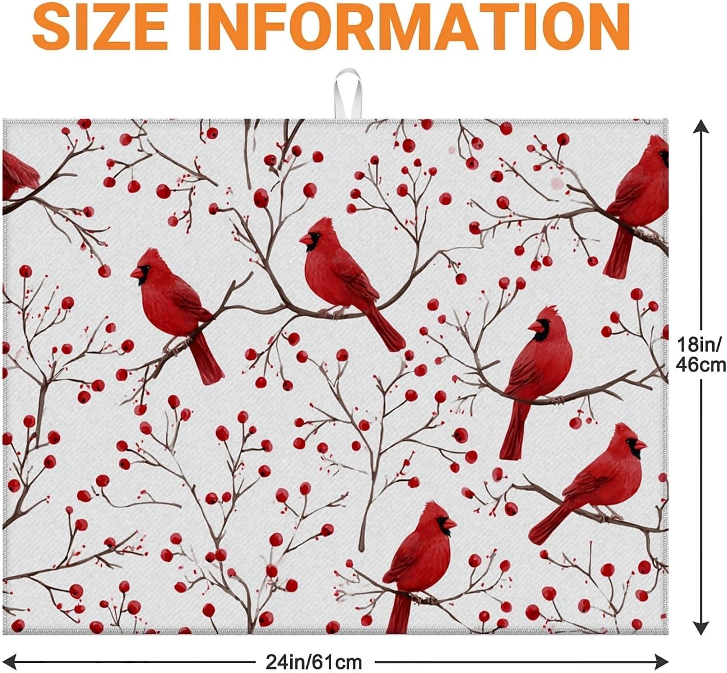 Dish Drying Mat For Kitchen Counter, Cardinal Bird Red Berry Microfiber Absorbent Dish Drainer Rack Pad Reusable Large 18x24in Drying Mat