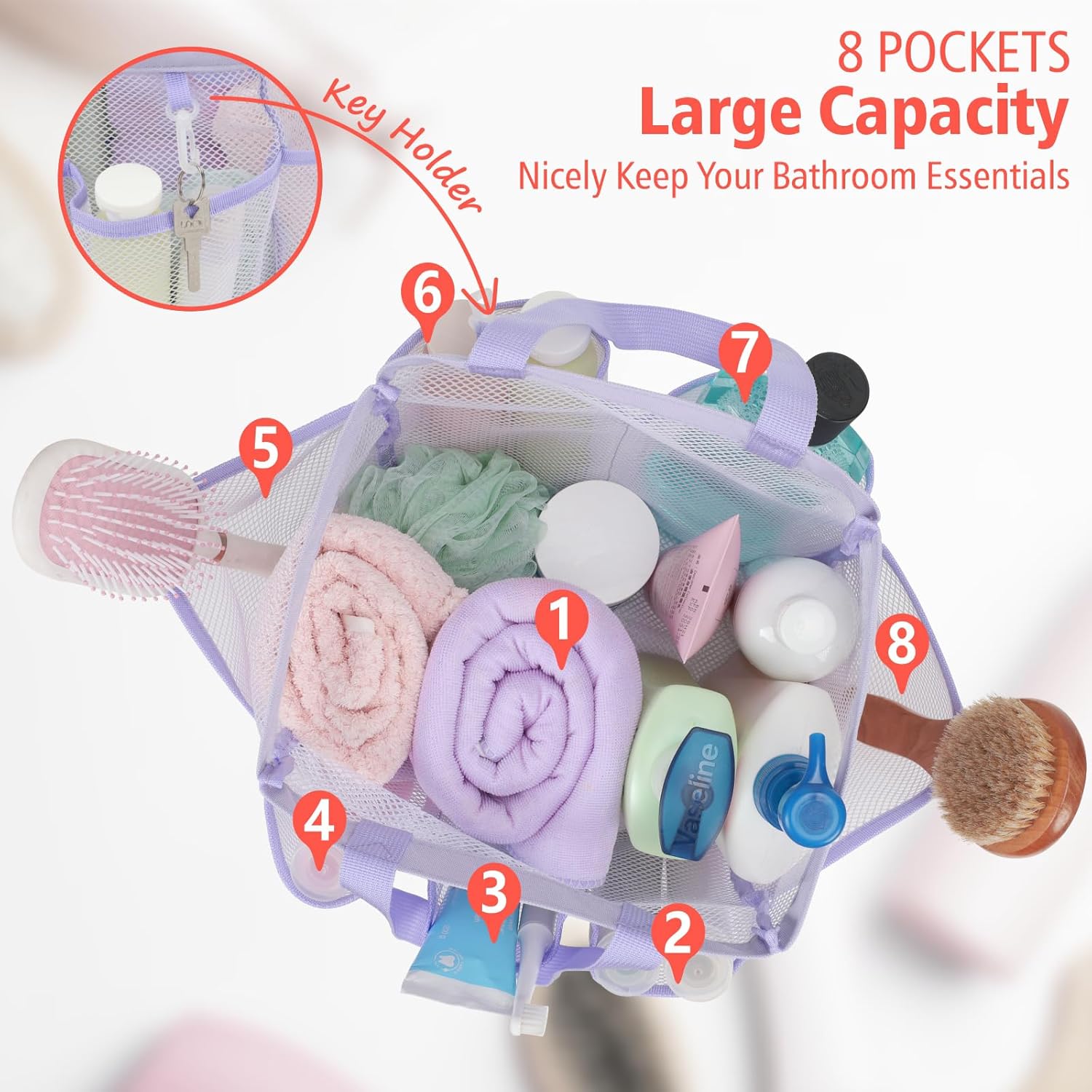 F-color Mesh Shower Caddy Portable, Upgrade Deeper 7 Pockets Shower Bag Basket Tote for College Dorm Room Toiletry Bathroom Essentials Gym Camp Quick Dry 2 handles with S Hook, Purple