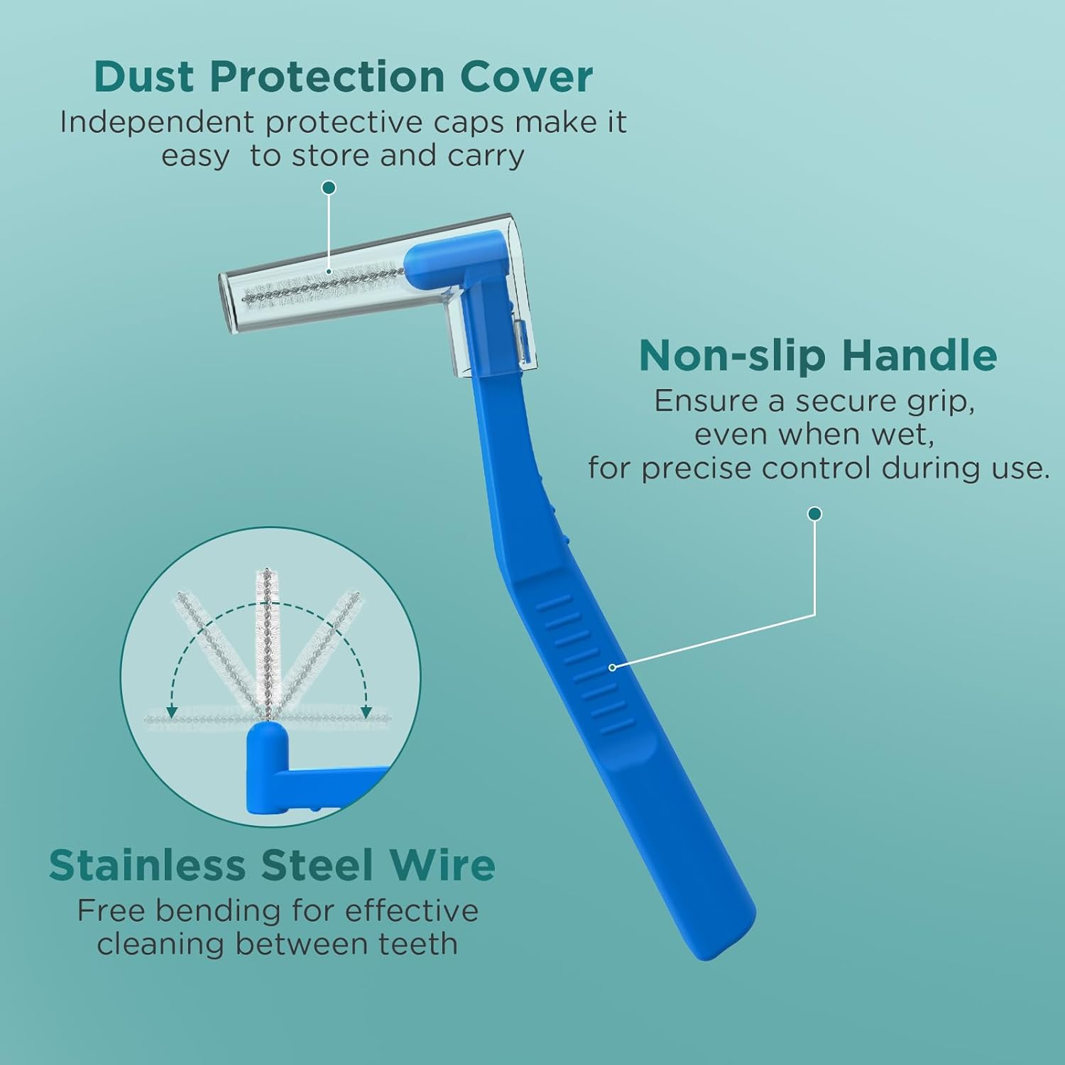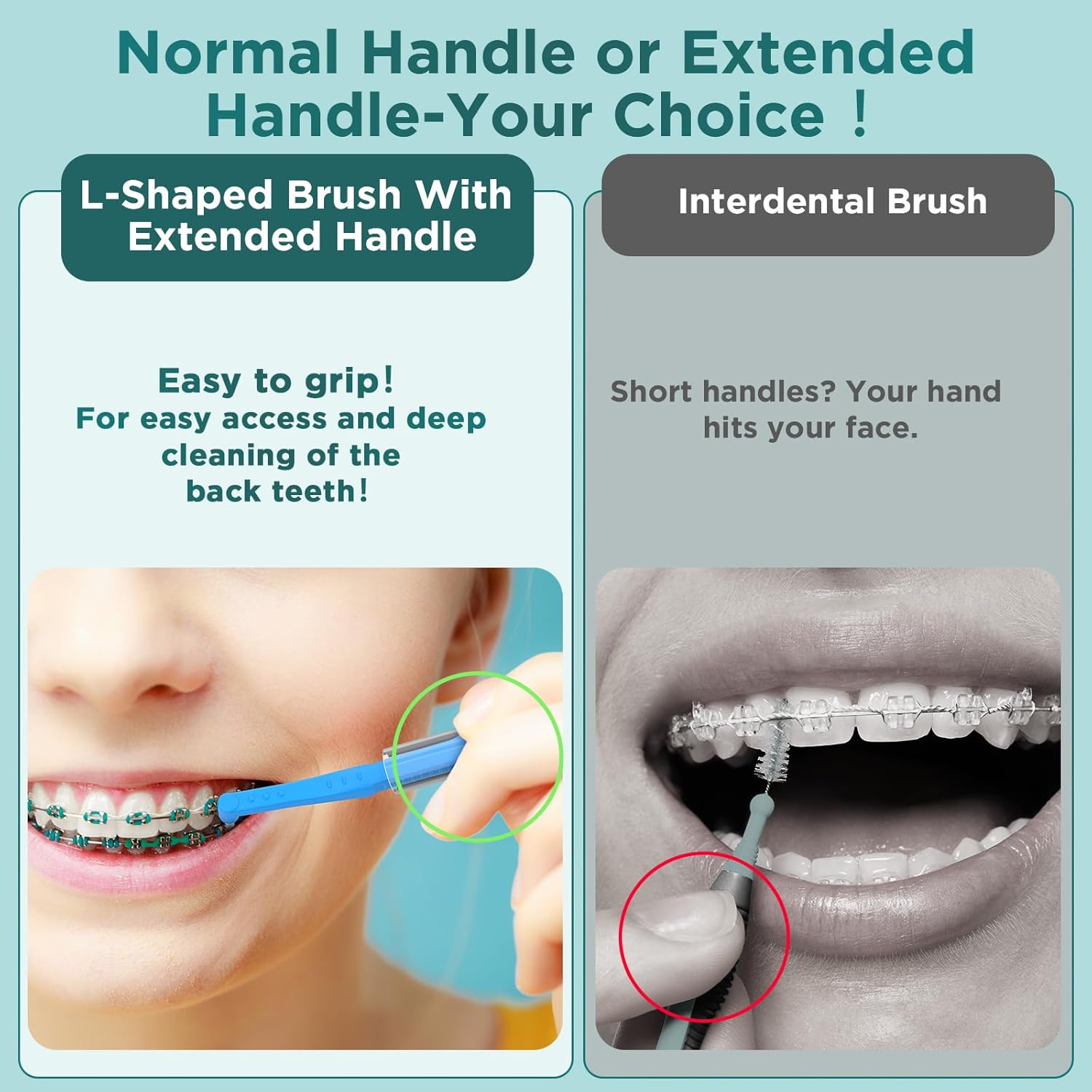 - ANGLE INTERDENTAL BRUSH WITH EXTENDED HANDLE: L-Shaped brush with extended handle facilitates deep cleaning teeth. A non-slip handle and angled neck make it easy to maneuver to the back of the mouth while proxy brush cleans around braces, bridges, implants. Normal handle or extended handle-your choice !