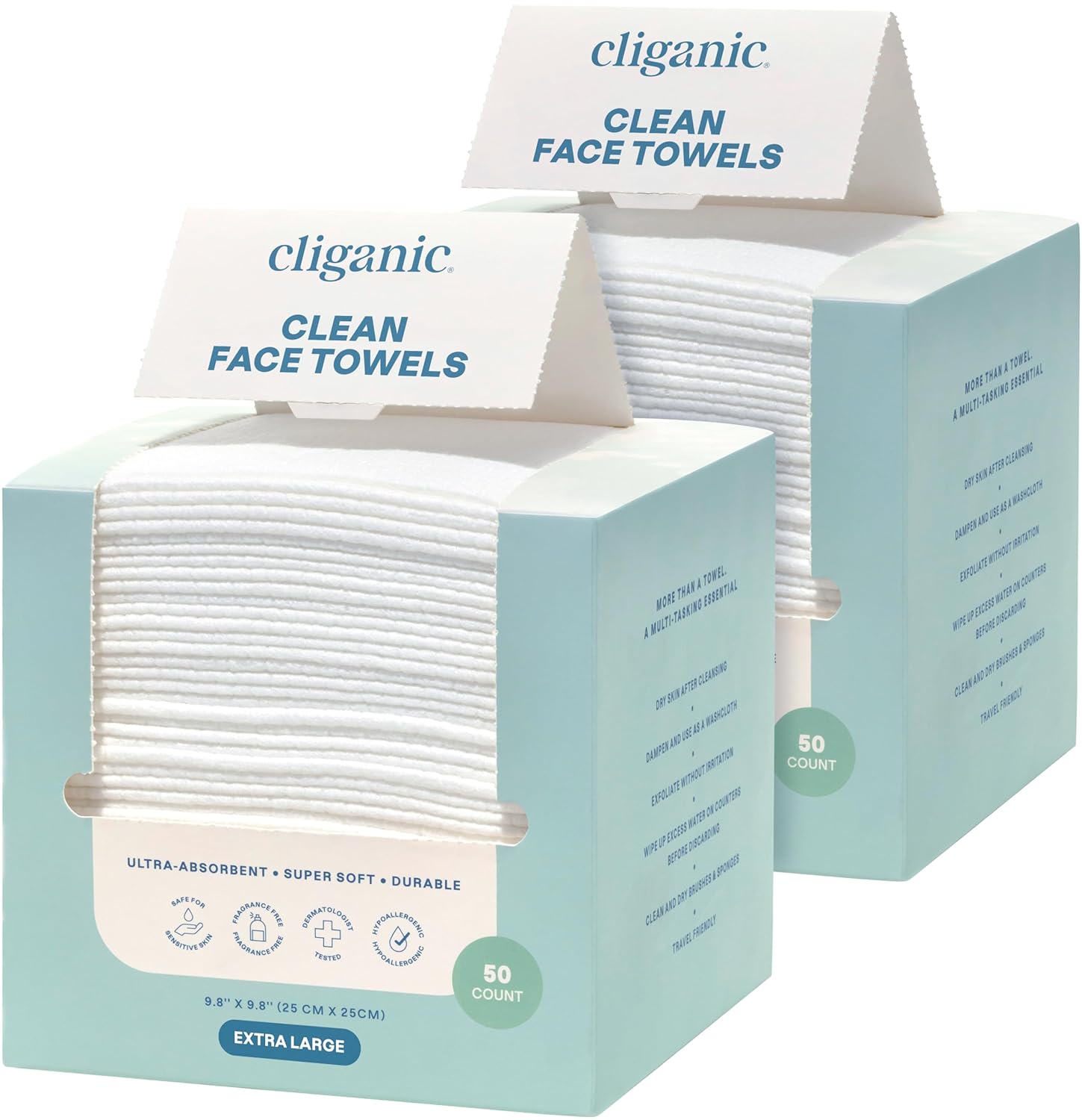 - Cliganic Clean Face Towels - Super-soft, extra-absorbent, hypoallergenic, durable, disposable face towels to gently dry and pamper your face.