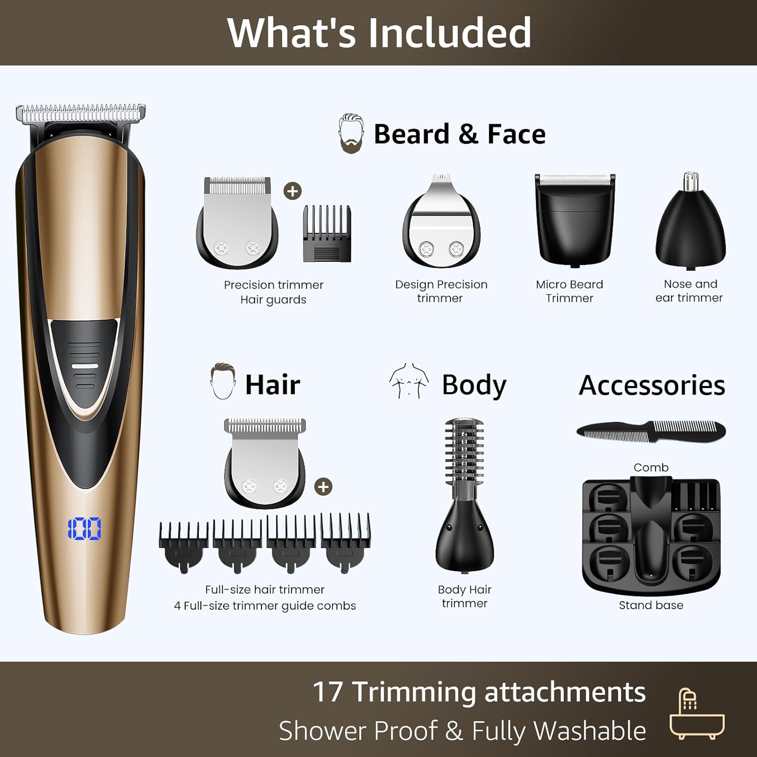 Electric Beard Trimmer for Men: 16-in-1 Professional Barber Hair Clippers - Cordless Grooming Kit - Turbo Speed & Precision Blades, Gold