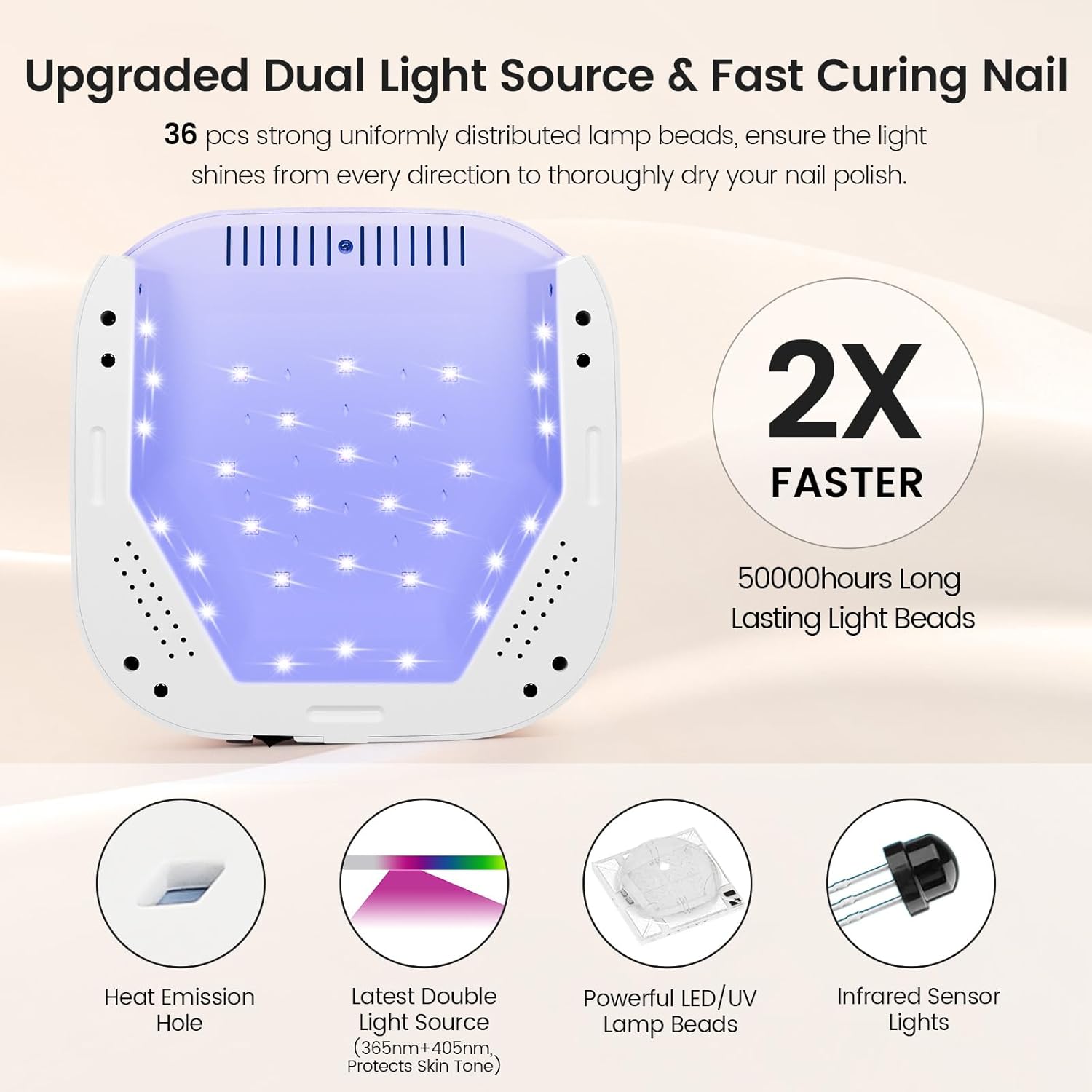 - 【Dual Light Source & Fast Curing Nail】Lavinda gel UV led lamp comes with 36pcs dual light source lamp beads, the light shines from all directions and dries nail polish quickly. And the light is soft (365+405nm) and not glaring which won't hurt your eyes and without tanning your hands. This flash cure lamp can fast dry all types of manicures and nail art.