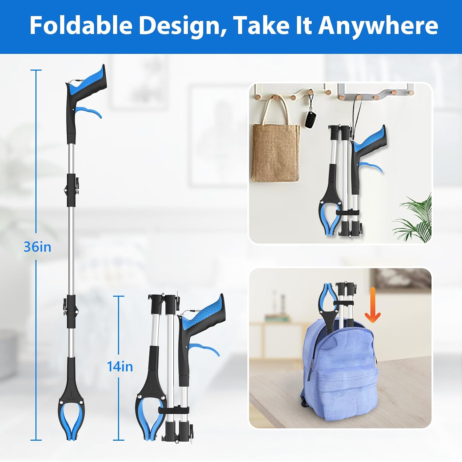 - 【Convenient Foldable Design】Quickly folds to just 14 inches for easy storage and transport when not in use. Simply unlock the sturdy metal clasps and fold the sections, then secure with the attached Velcro strap. This Reacher Grabber Pickup Tool is perfect for storing in cabinets, car trunks, or attaching to walkers and wheelchairs while maintaining full 36-inch reach when extended