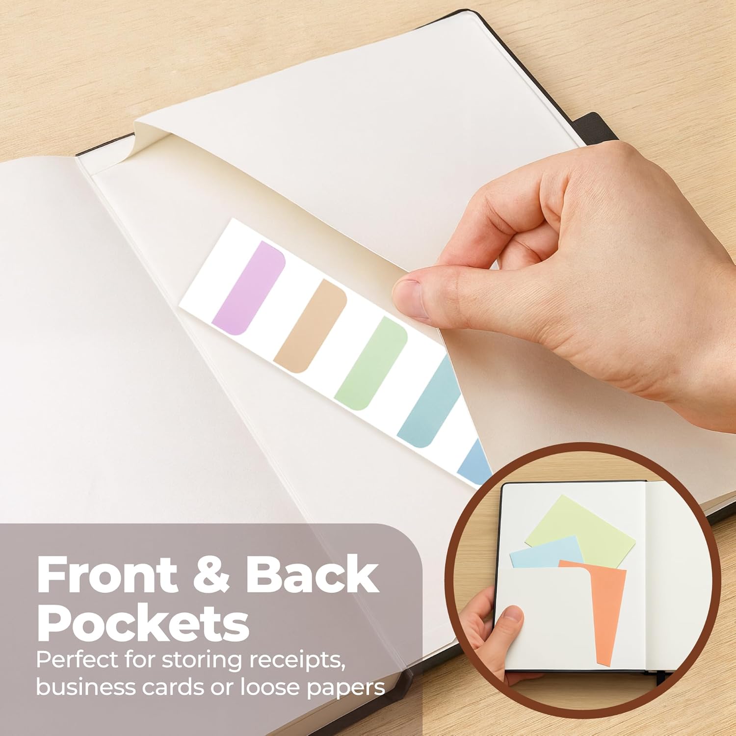 - DESIGNED WITH FUNCTIONAL FEATURES – Stay organized with built-in front and back pockets for loose notes or stickers, elastic closure band to keep pages secure on the go, and dual ribbon bookmarks to quickly find important sections. The pen holder means your favorite writing tool is always within reach. And it also comes with free sticky tabs to mark pages, organize sections, and quickly find your most important notes!