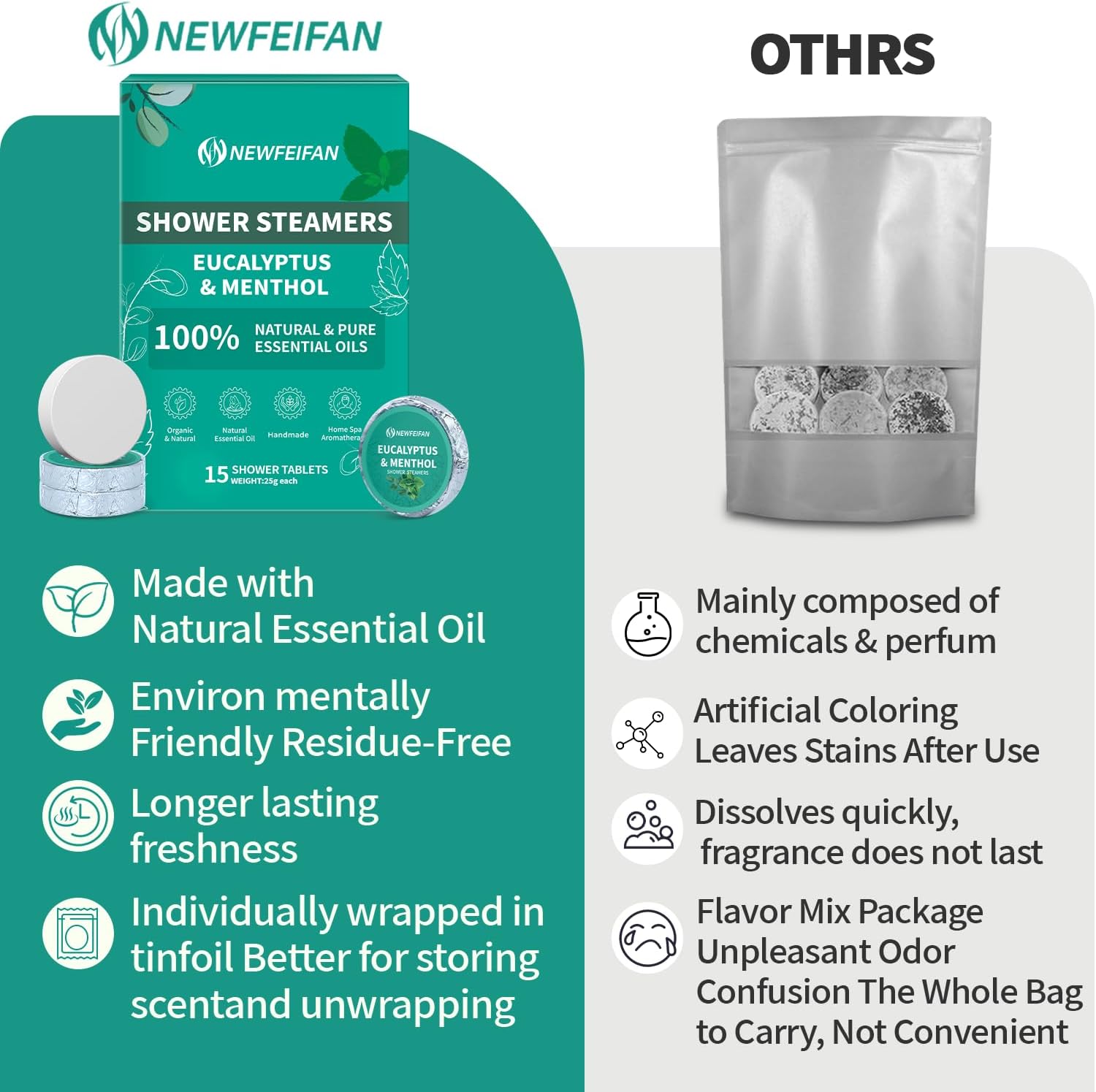 - [AROMATHERAPY RELIEF JOURNEY] For the best shower experience, we have researched many shower bombs on the market and upgraded and improved their scent, shape, and size, Also add yarn bag hanging way shower experience, NEWFEIFAN shower steamers are naturally fragrant, it allows you to take a slow deep breath and enjoy every moment of relaxation, try this home spa set now