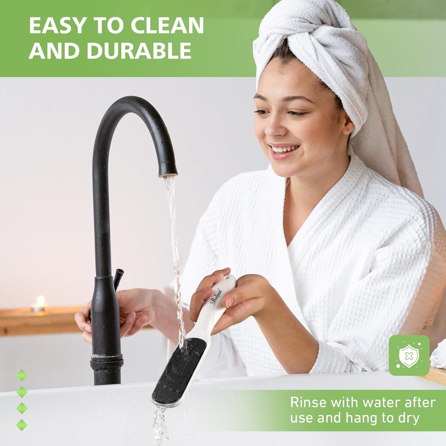 - Easy to Clean and Hygiene: Unlike disposable emery boards or cheap foot files, BALUCA’s glass foot callus remover is built to last years. The Imperforate & Seamless feet scrubber dead skin remover can be clean easily. After use, simply rinse under running water and hang by the handle to air dry.
