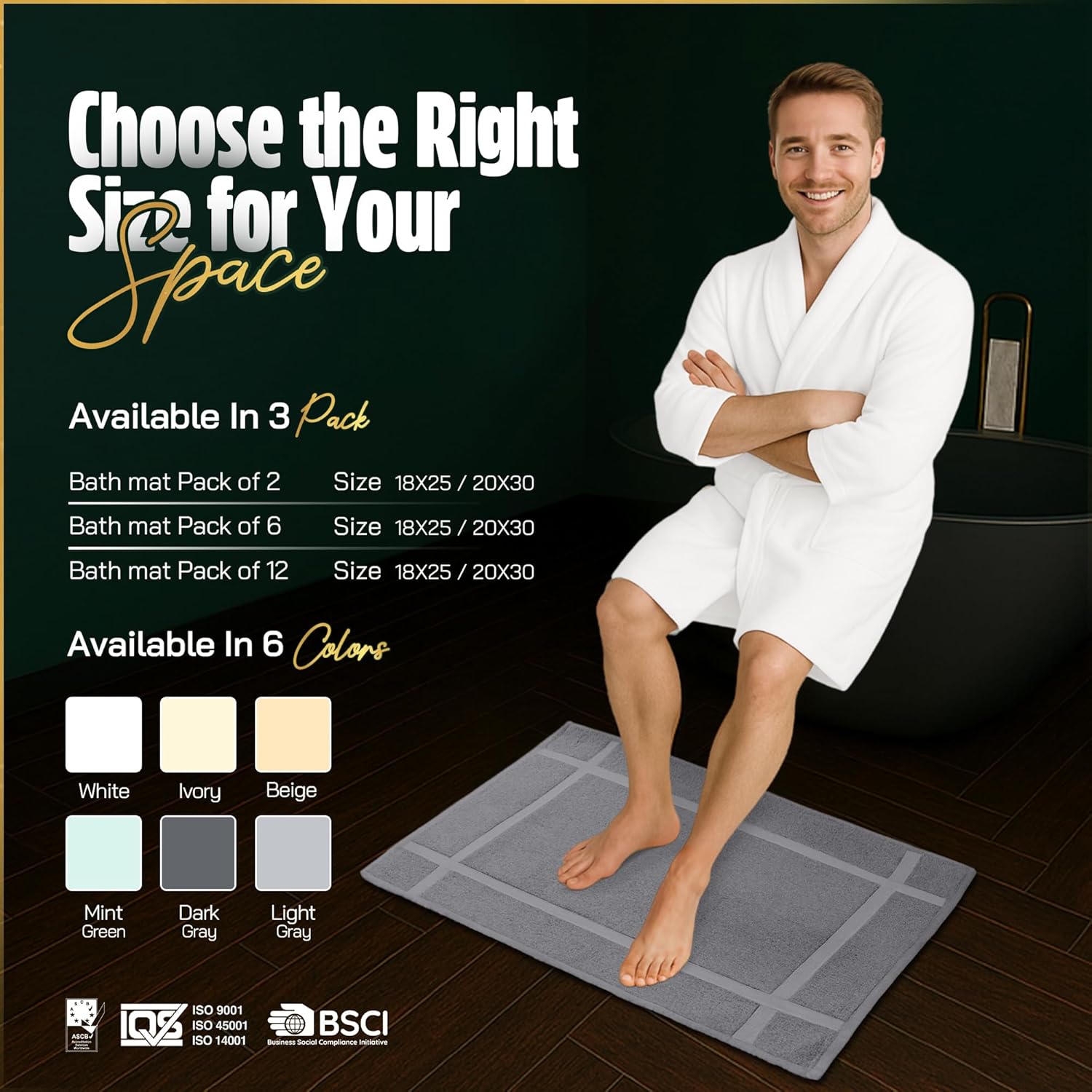 Pearl Linens Pack of 6 Washable Cotton Bath Mat 18x25 - Soft & Absorbent Quick Dry Bathroom Mat Set, Not Bathroom Rugs After Shower Mat, Terry Bath Tub Mat, 687 GSM Light Grey