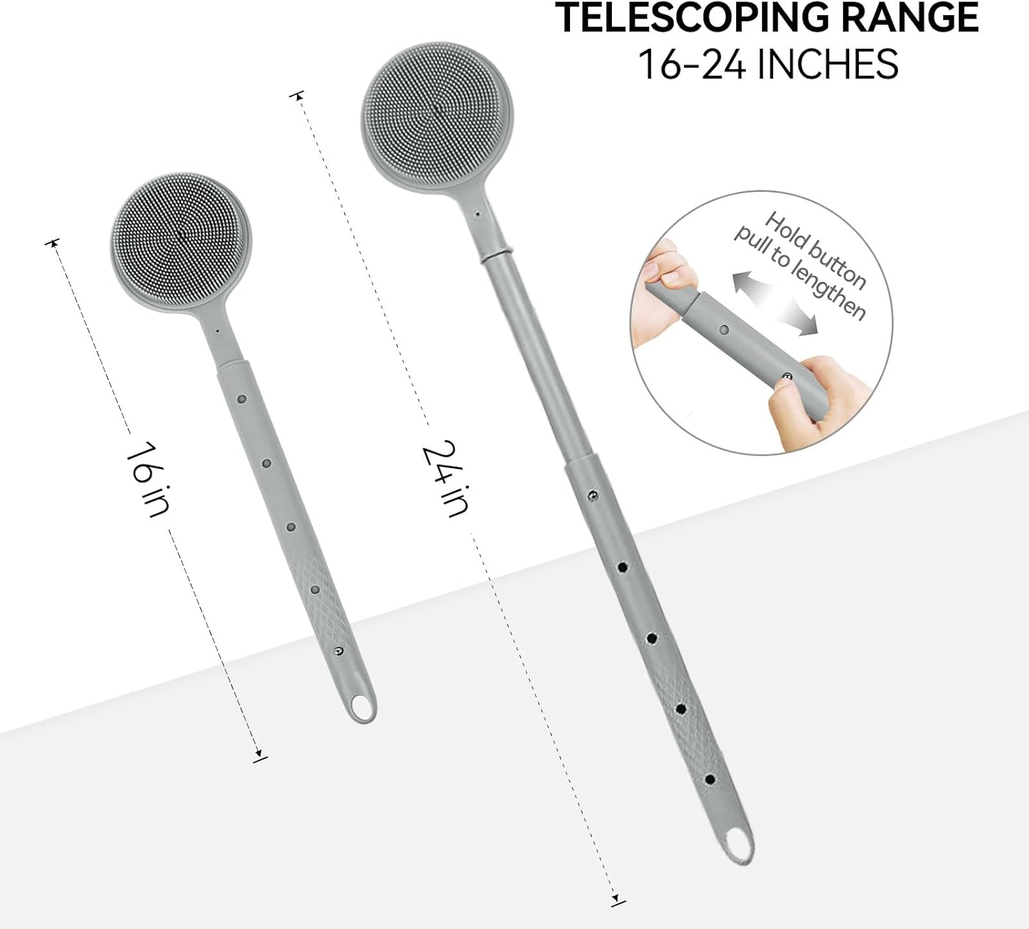 Back Scrubber for Shower, (16-24 Inch) Extendable Bath Brush Long Handle for Shower, Silicone Body Scrubber with Handle, Back Brush for Shower Men and Women,Easy to Clean (Gray)