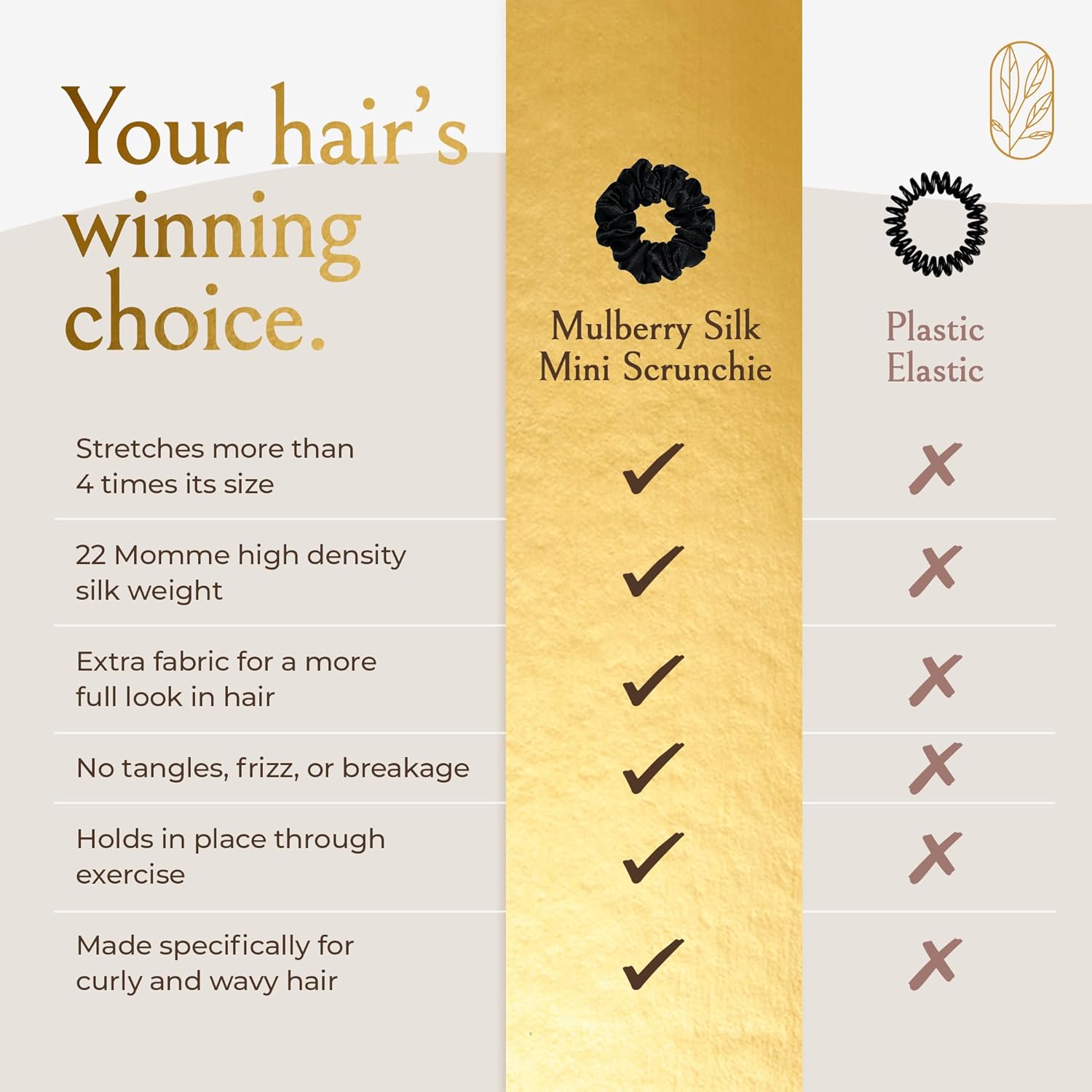 - HAIR-FRIENDLY AND GENTLE: Our mini silk hair ties are the choice for women looking to prevent frizz and breakage or presents. The silk material is gentle on your hair, making these black scrunchies for women for both daytime styling and nighttime wear. Wake up to smooth, tangle-free hair every morning with our small silk scrunchies.