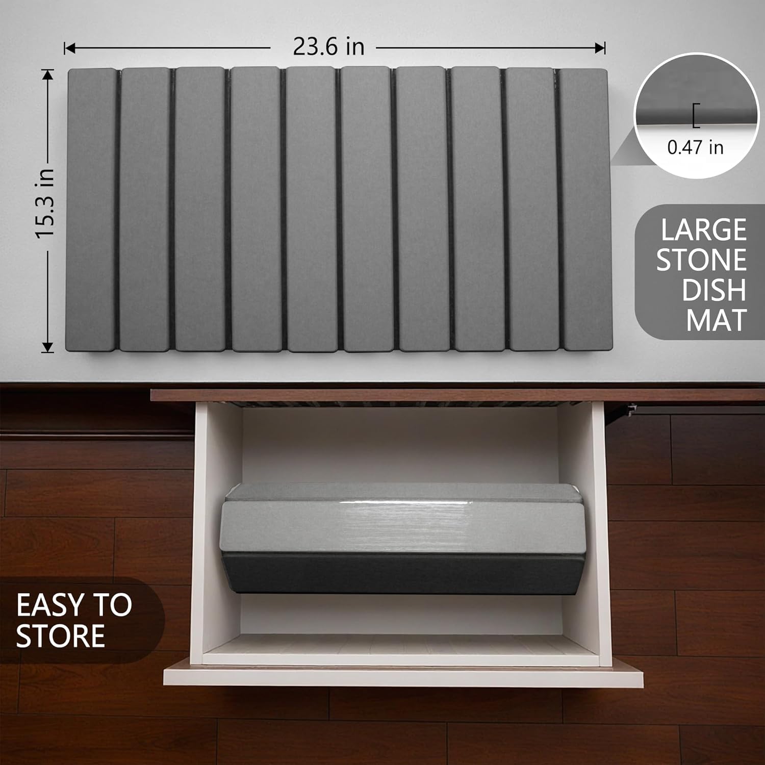 Stone Drying Mat for Kitchen Counter, Quick Dry Absorbent Collapsible Dish Drying Mat, Eco-Friendly Absorbent Diatomaceous Earth Mats for Dishes Bottles Cups Bathroom Any Counterop 24" x 15"