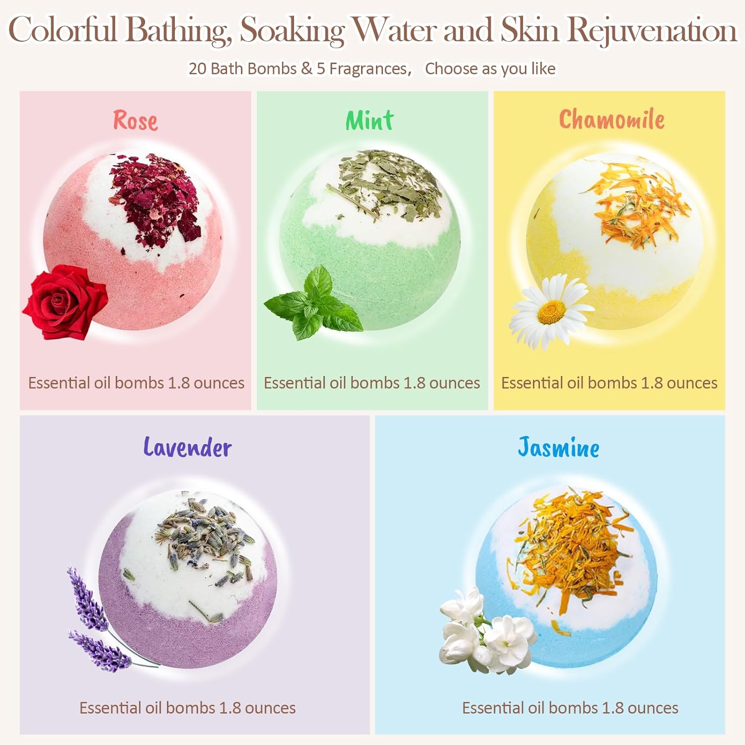 - Blossoming Floral Fragrance Bouquet: Breathe in a garden of natural scents! This kit bursts with the enchanting aromas of Lavender, Rose, Chamomile, Jasmine, and Mint (4 bombs each). Enjoy pure, preservative-free fragrance that transforms your tub into a blooming paradise