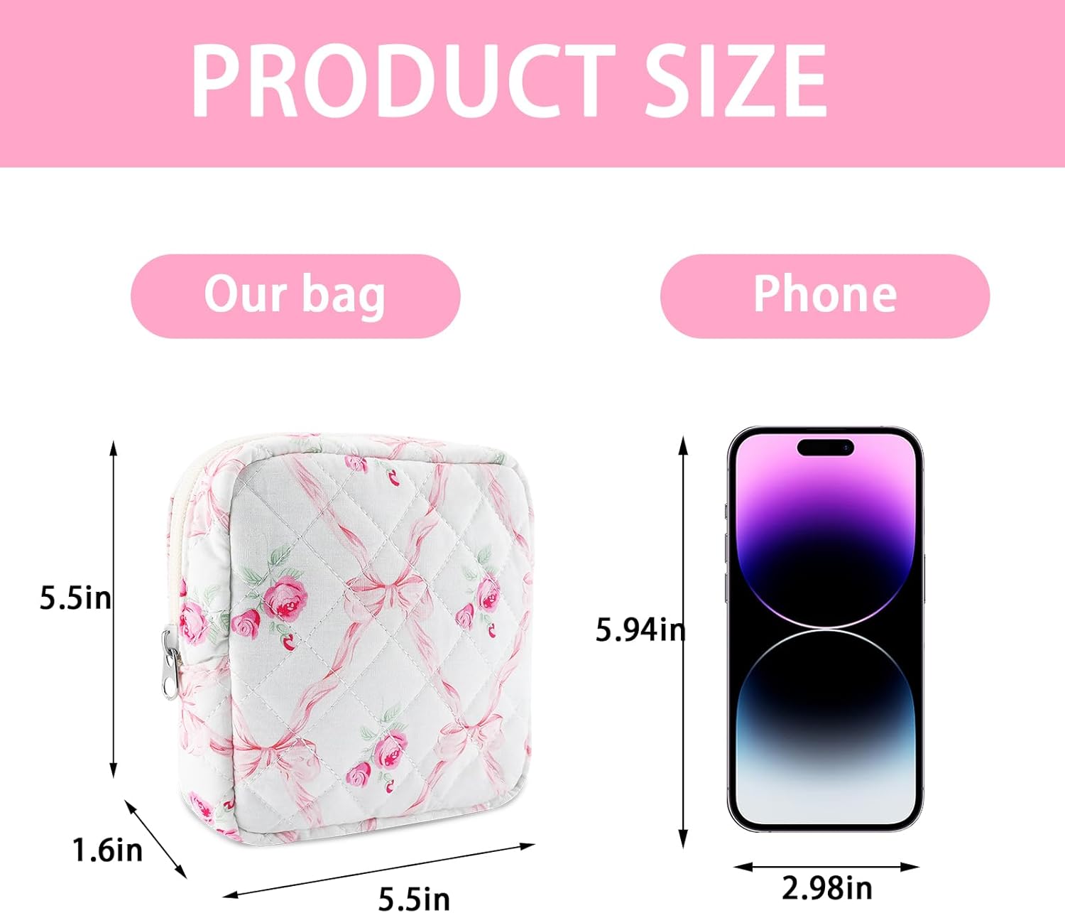 Small Quilted Cotton Makeup Bag for Purse Mini Cosmetic Period Bag for Women Cute Pink Flower Bow Makeup Sanitary Pouch Portable Travel Toiletry Bags with Zipper Slip in Pockets Birthday Gifts