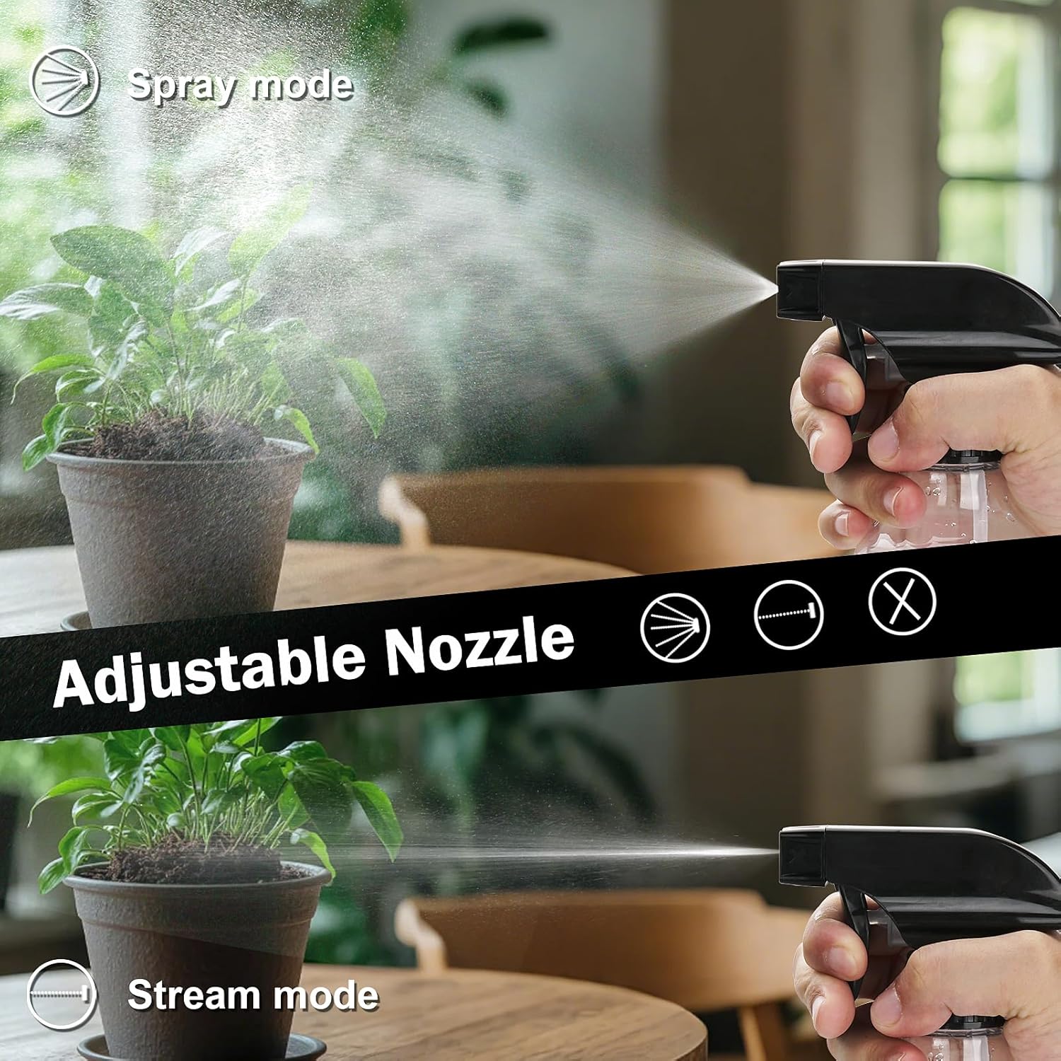 - ADJUSTABLE NOZZLE SPRAY BOTTLE: With 3 way adjustments. Easily switch between a fine mist (perfect for hairstyling or delicate plants) and a solid stream (for heavy-duty cleaning). The extended suction tube ensures every drop is used, making it a versatile water spray bottle for multiple needs.