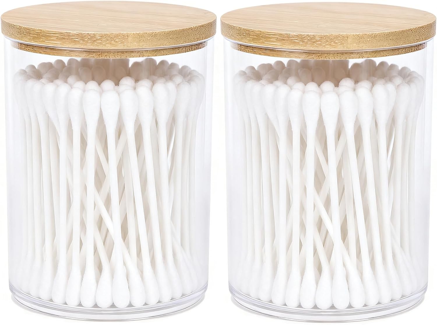 AXX Qtip Dispenser Apothecary Jars Bathroom - Qtip Holder Storage Canister Clear Plastic Jar for Cotton Swab,Q-Tips,Cotton Rounds (H#Bamboo 2Pcs)