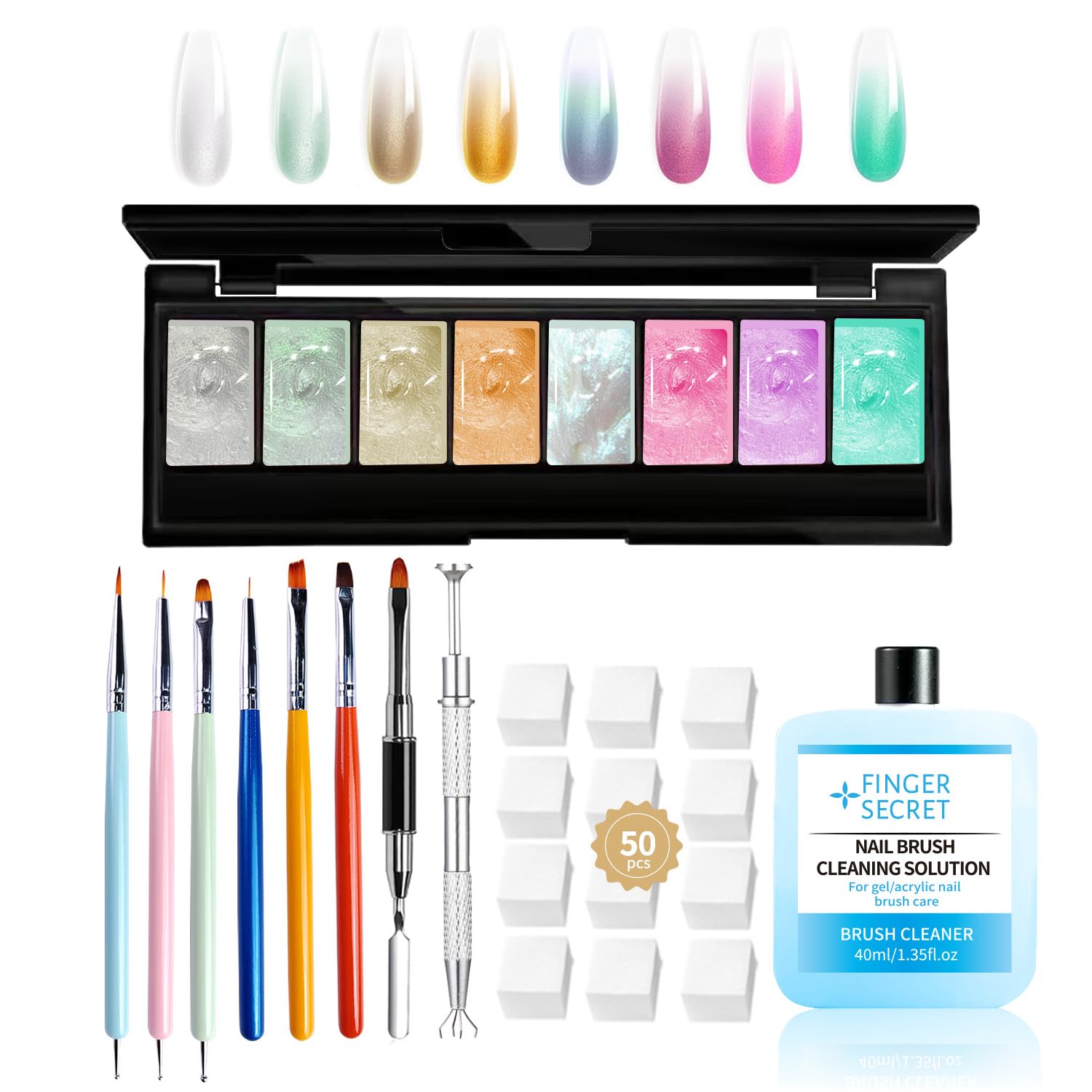 - Finger Secret Ombre Gel Polish:The omber gel colors set include 1* finger secret 8 color ombre gel pat come with 50 pcs sponge+ 1*cotton claw+1*Double-headed pen+ 6-color phototherapy pen & dot drill brush set +1*40ml nail brush cleaning remover meets the nail art needs of different scenarios. Moreover, the ombre gel nail polish set is lightweight and portable, allowing you to have shiny nail art all the time.