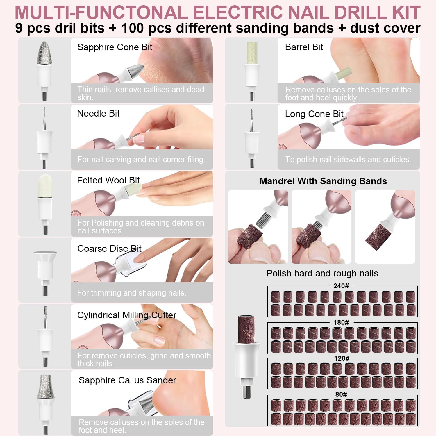2 Pack Electric 9-in-1 Cordless Nail Drill with 100 Bits, 5 Speeds, Home & Salon Must-Have