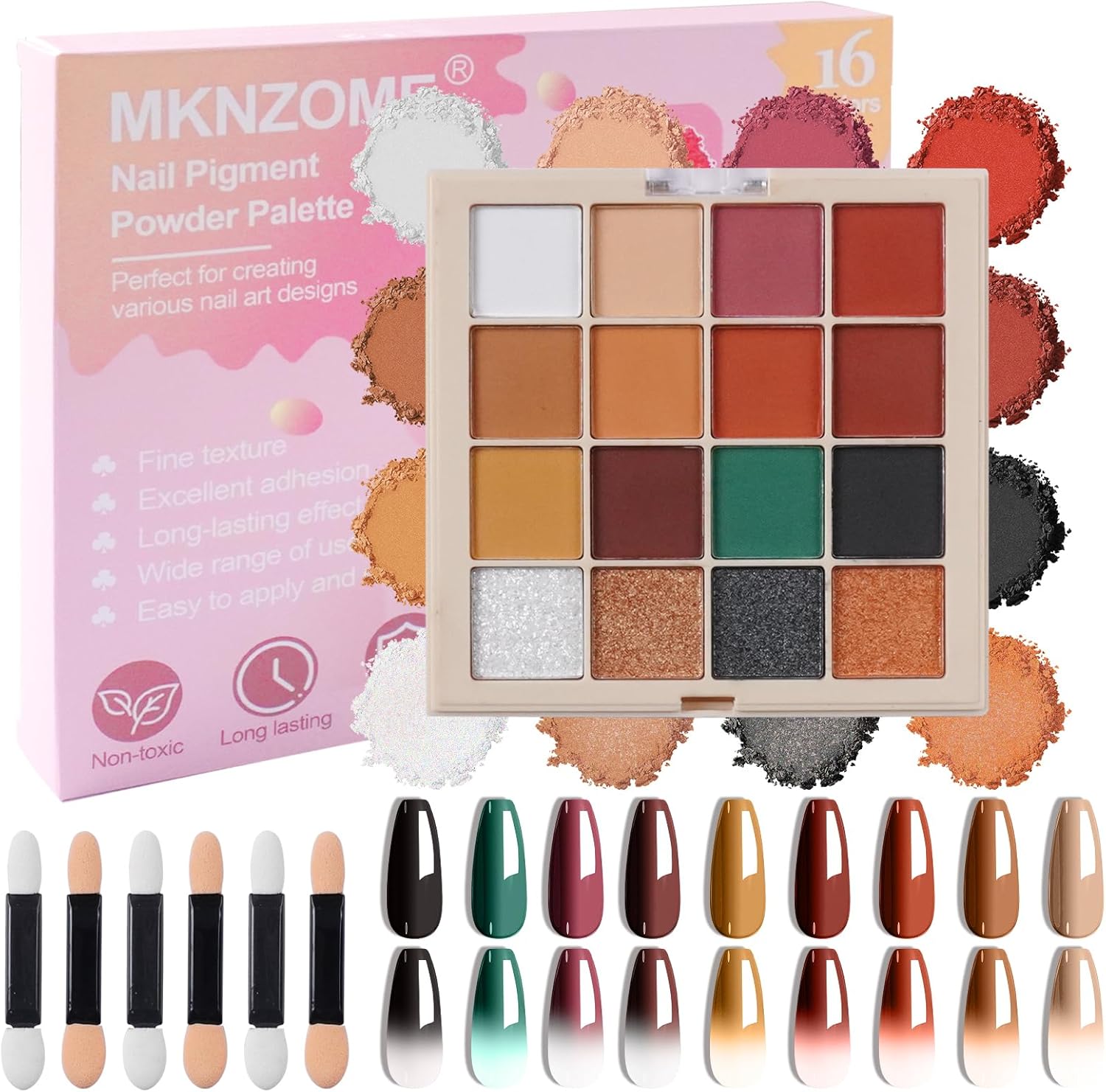 - 【Vibrant Nail Pigment Powders】Enhance your nail art creations with the MKNZOME pigment powder for nails. This set includes a range of highly pigmented powders that will bring vibrant colors and stunning effects to your nails. You will get a 16-color palette and 6 double-ended sponge brushes for nail painting.