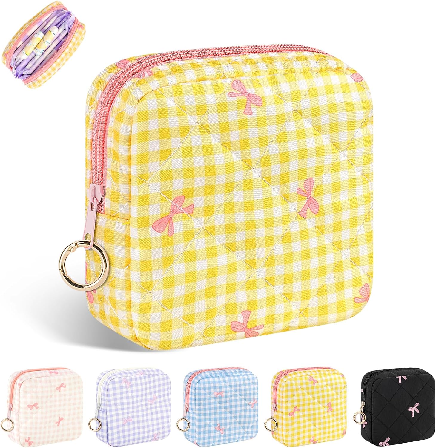 Period Bag for Teen Girls, Quilted Sanitary Napkin Storage Bag, Cute Bow Tie Menstrual Pad Pouch Tampon Holder (Plaid Yellow)