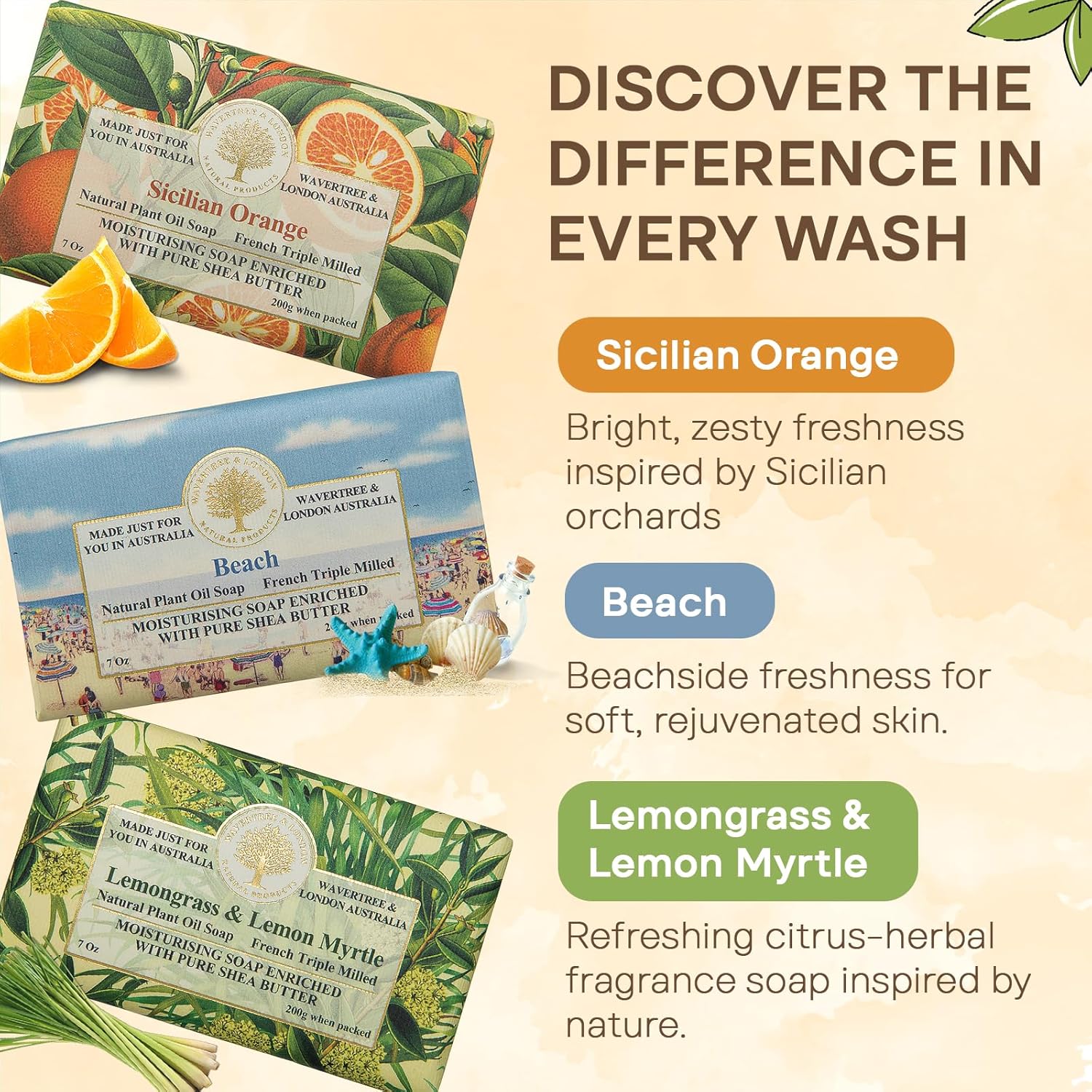- 🌿 Wavertree & London’s Best Scented Soap Bars ➤ This natural soap bars variety pack includes 6 of our most-loved scents: Lavender D’Provence, Honey & Almond, Lemongrass & Lemon Myrtle, English Rose, Beach, and Sicilian Orange. Our natural bath soaps are richly fragranced, beautifully textured, and ideal for gifting or daily use. Enjoy a scented soap bar for every mood.