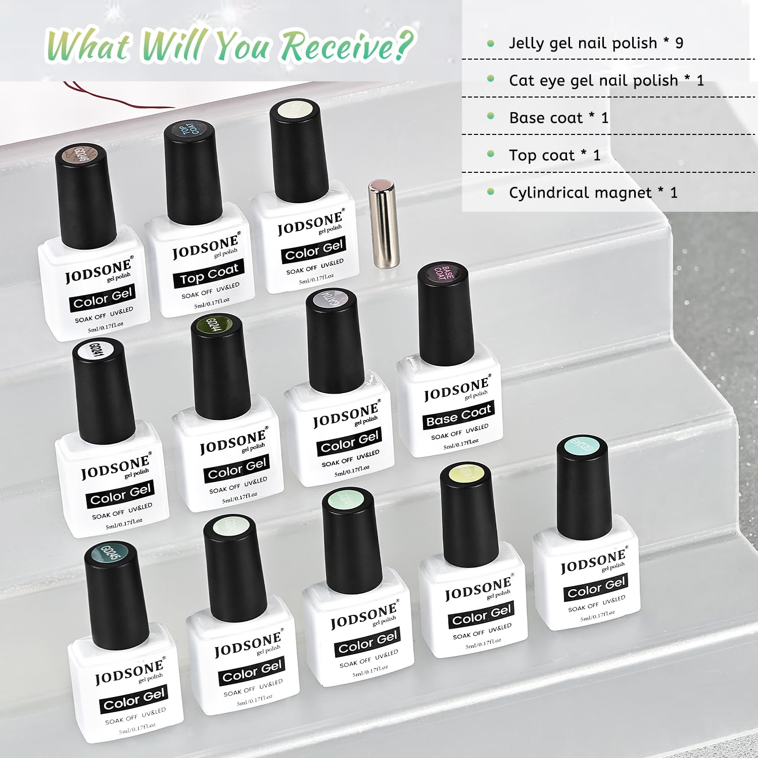 - You Will Receive: 9 bottles of cyan jelly color gel nail polish, including 1 bottle of coarse magnetic powder versatile cat eye, 1 bottle of base coat, 1 bottle of top coat, 1 magnet, This 9-color jelly gel set includes lake teal ,white teal ,soft blue teal.The cat eye gel nail polish features coarse magnetic particles. Upon close inspection, gray magnetic particles are visible, but when layered over transparent colors, they do not diminish the overall cat eye effect.