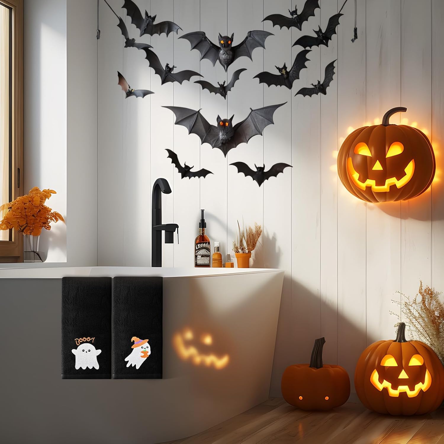 - 【2-Pack Halloween Hand Towels】 Set includes 2 black cotton towels with white ghost embroidery, combining spooky Halloween style with practical daily use